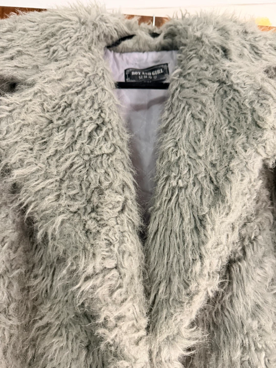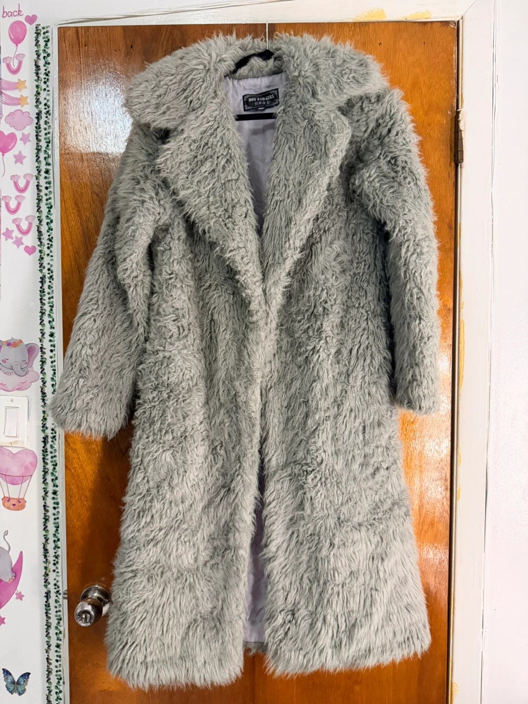 Long grey faux fur coat. It's a cozy and stylish outerwear piece. This coat has a comfortable lining and a classic collar. Great for cooler weather!