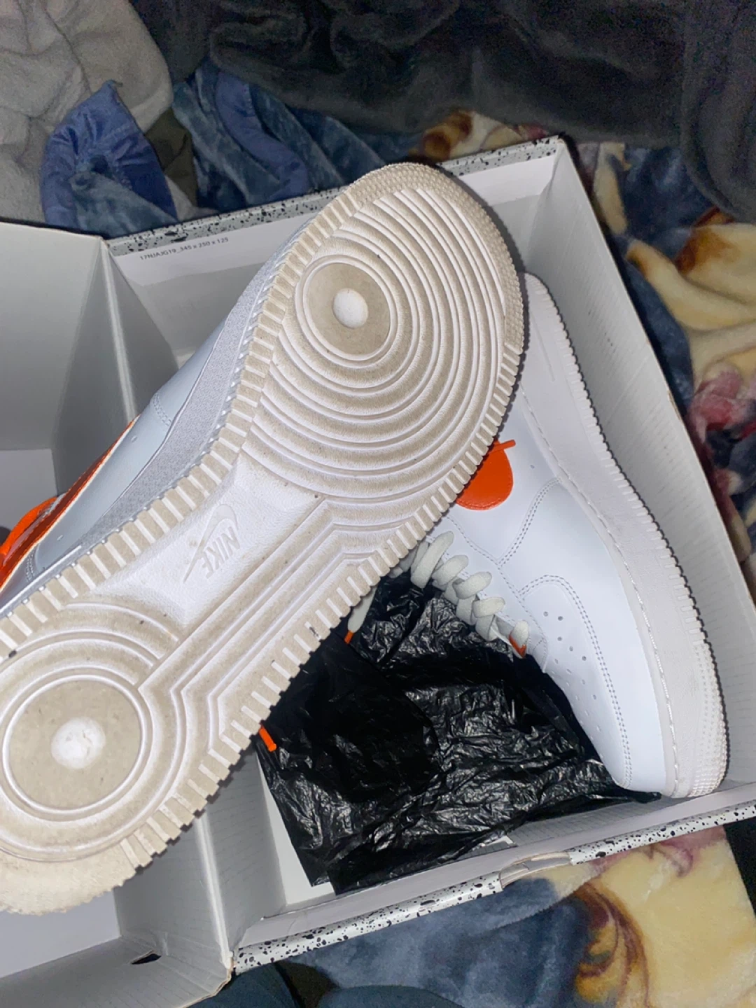 White Nike Air Force 1s with custom "joint" graphic on the side and orange laces. Includes original box. Some scuffing on the soles.