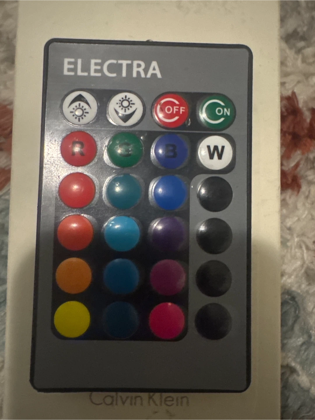 This is an ELECTRA remote control. It has buttons for On, Off, brightness adjustment, and colour selection including R, G, B, and W. It also has various colour options and black buttons.
