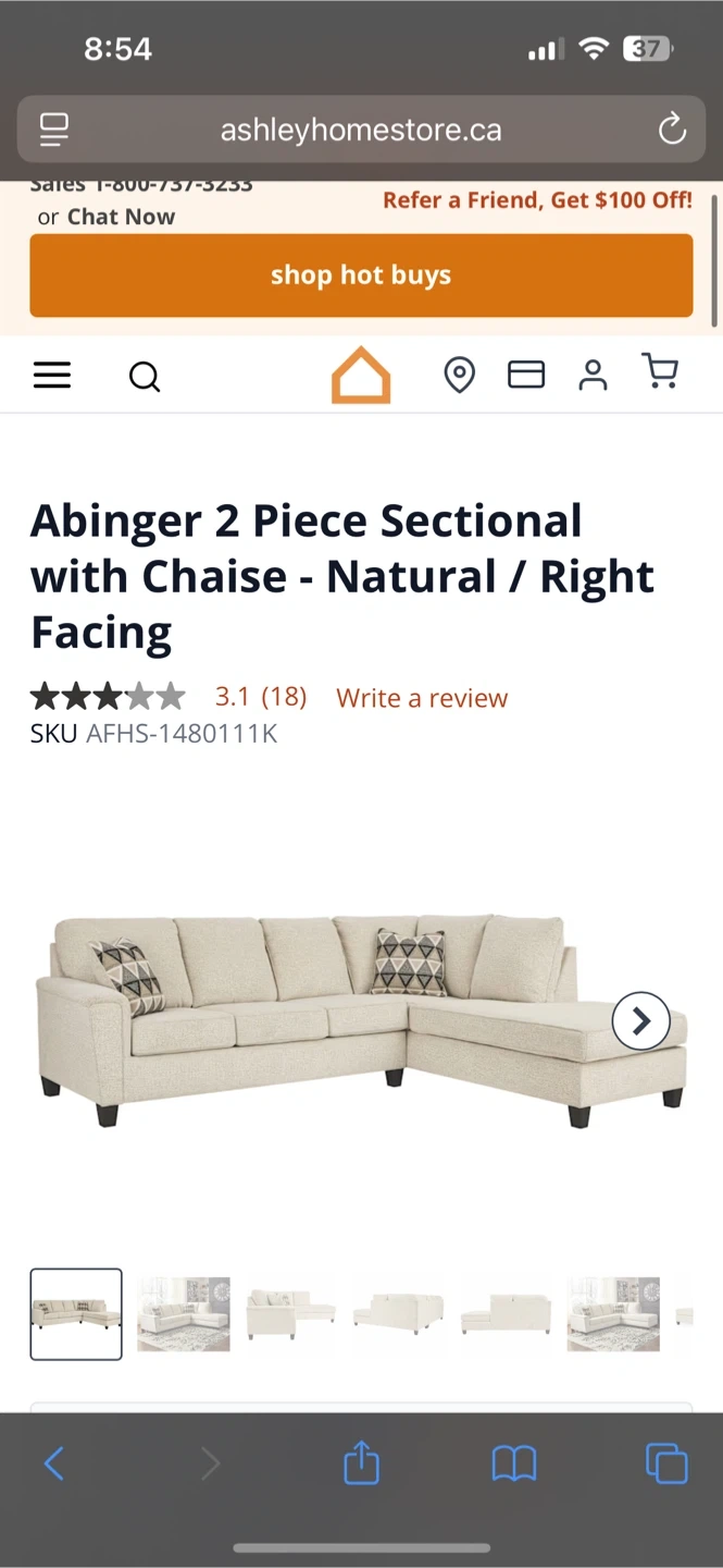 Website: See screenshot of the couch listed on Ashley’s. Note it is not longer available.