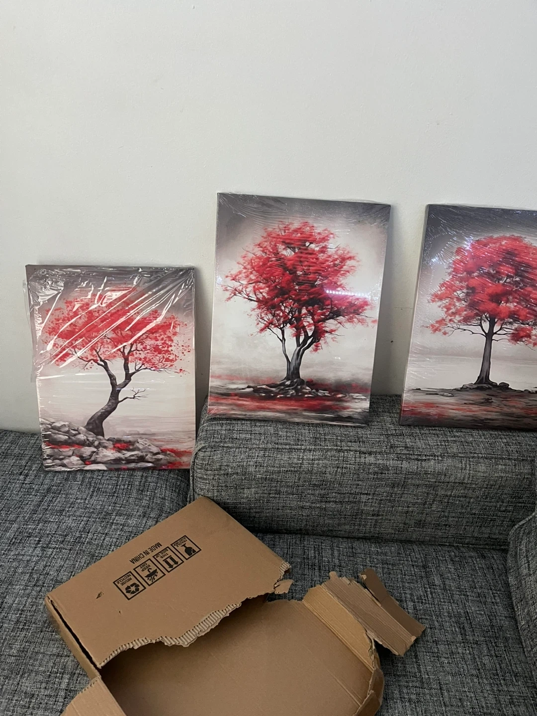 This set includes three canvas prints featuring a striking red tree design. Each piece is individually wrapped for protection. These prints would add a pop of colour to any room's decor.