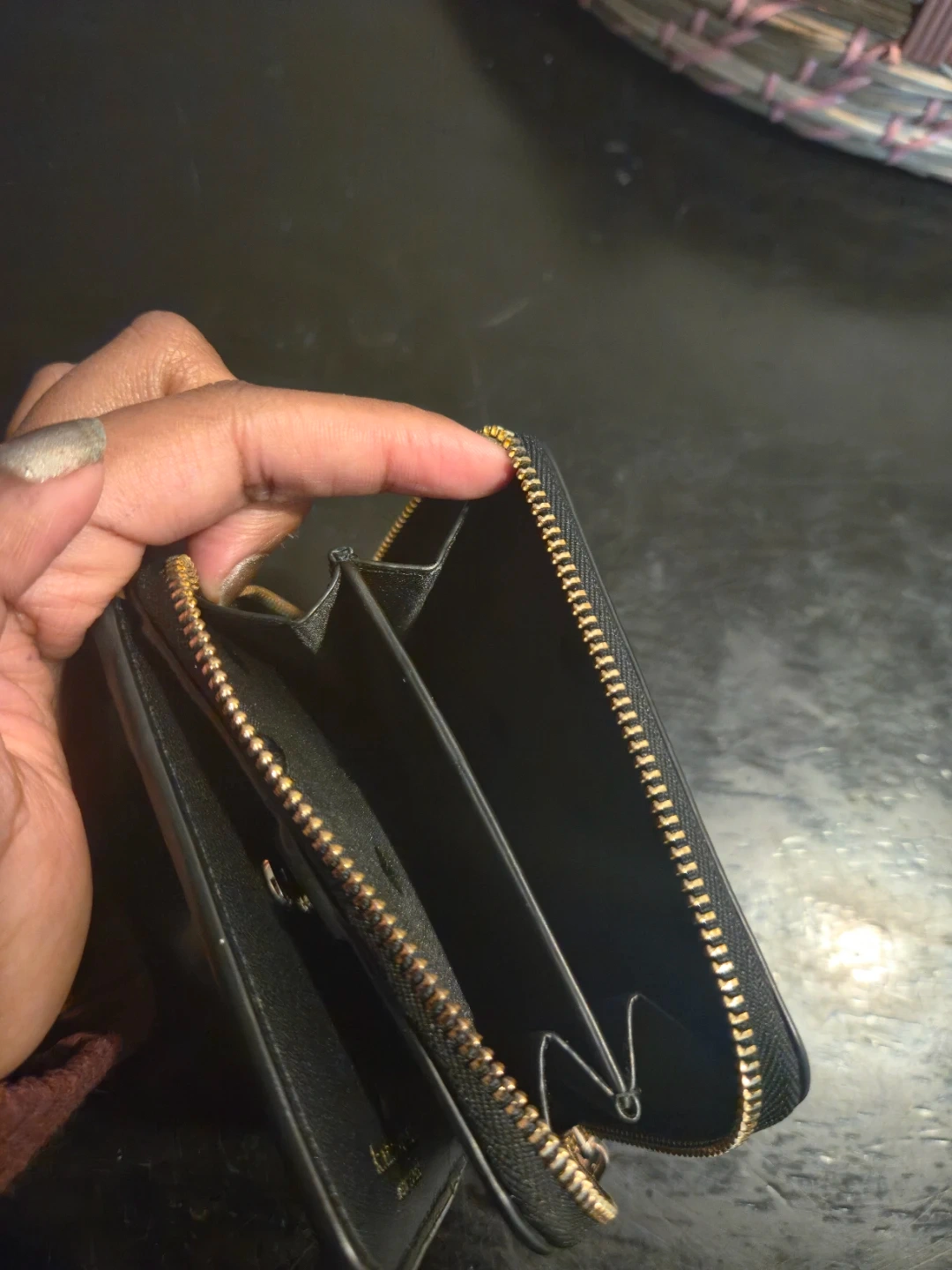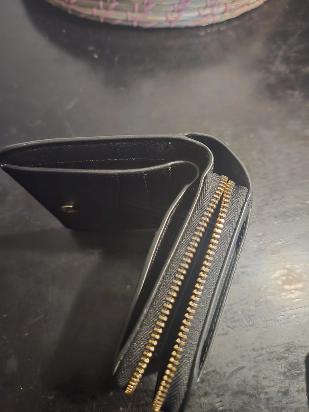 This is a black Kate Spade bifold wallet. It's made of leather and features multiple card slots and a zip coin pocket. This wallet would be handy for organizing your essentials.