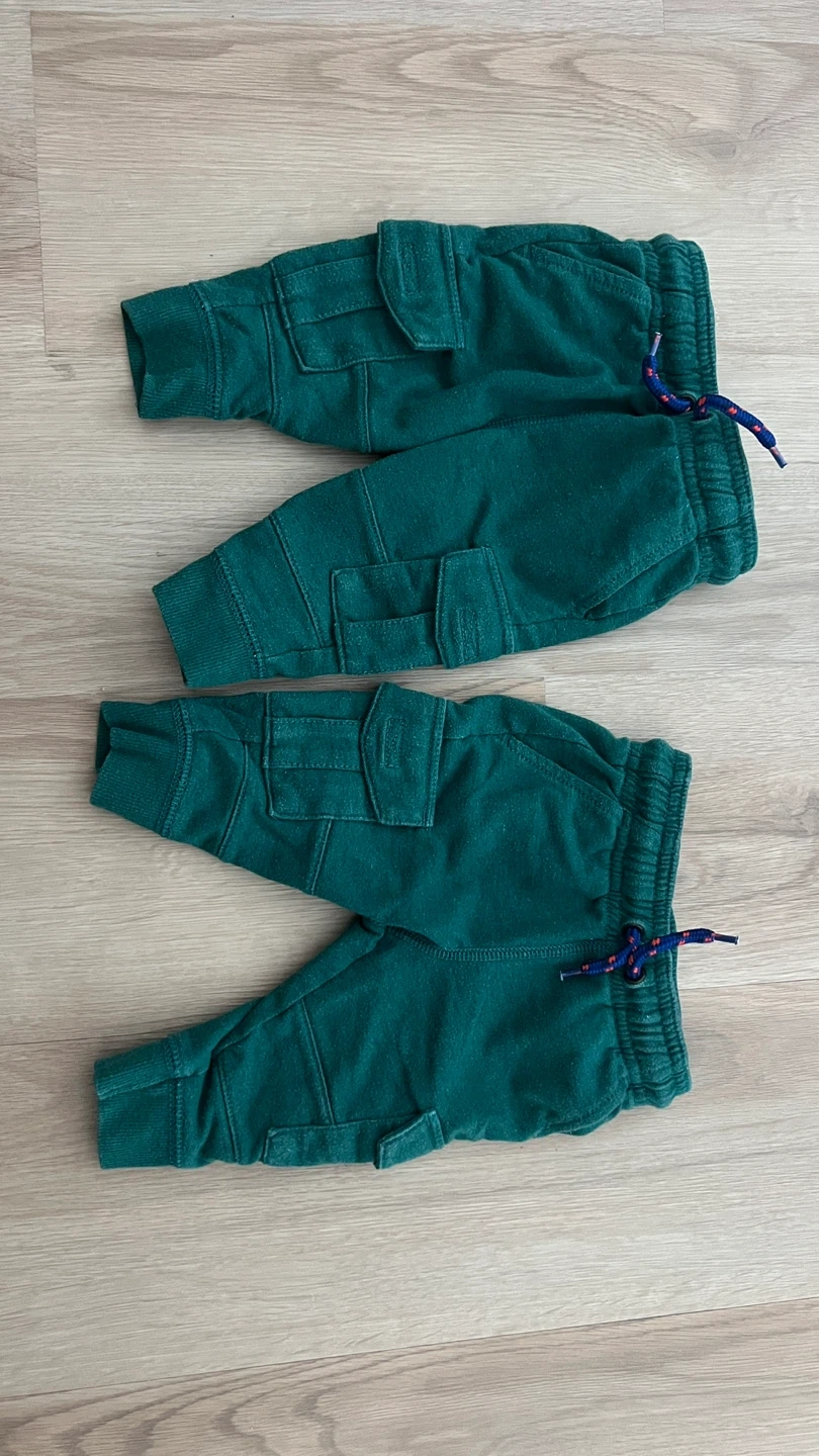 This bundle includes a Mickey Mouse hooded romper, patterned pants, blue joggers, and two green cargo pants. Also features two green long-sleeved shirts with pumpkin graphics and two light blue muslin overalls. Great for a baby's wardrobe!