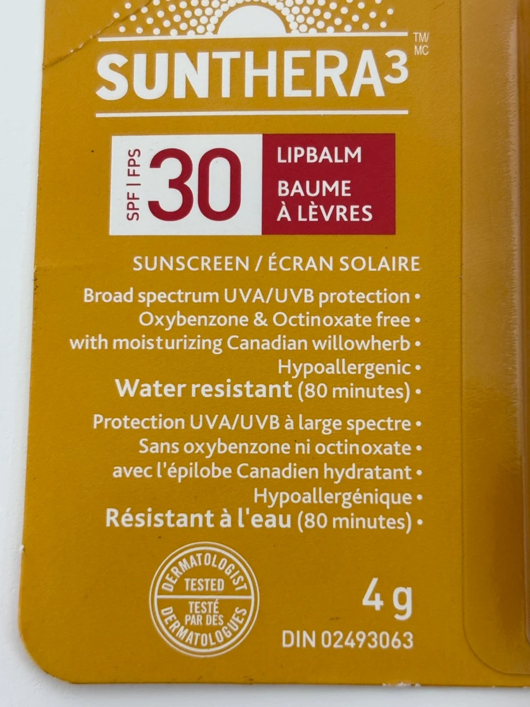Sunthera3 Lip Balm SPF 30 offers broad-spectrum UVA and UVB protection to shield delicate lip skin from sun damage. This dermatologist-tested formula is hypoallergenic and free from oxybenzone and octinoxate. It provides water resistance for up to 80 minutes, making it a reliable choice for outdoor activities. Designed for both adults and children over six months, it helps keep lips moisturized and protected.