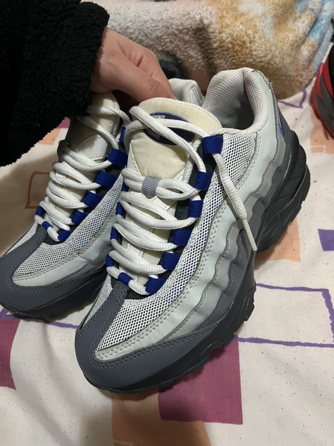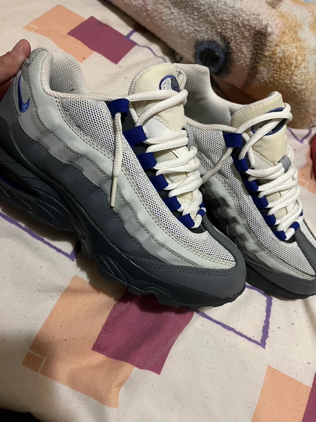 These Nike Air Max 95 sneakers come in a white, grey, and blue colorway. They feature a lace-up closure and the iconic Air Max cushioning system. These are great for casual wear or athletic activities.