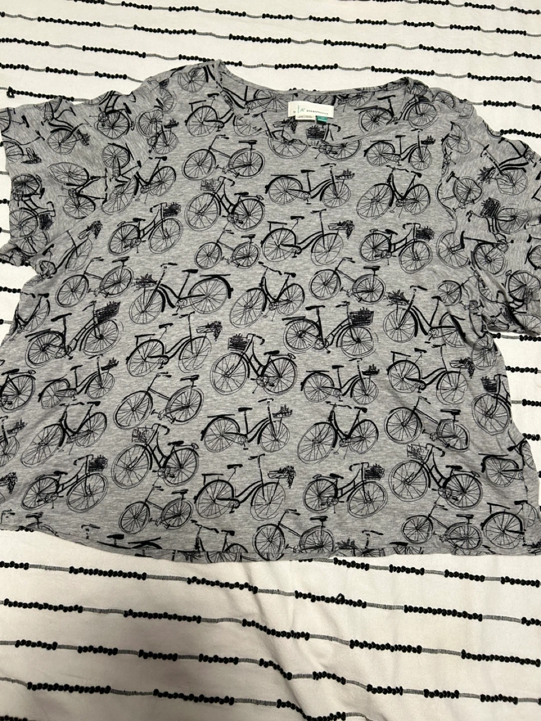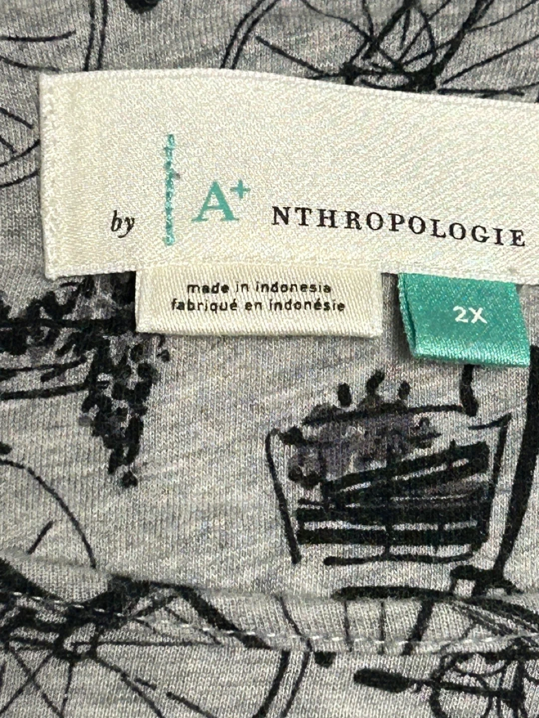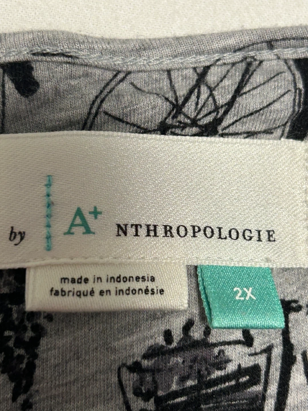 Anthropologie grey t-shirt with a black bicycle print. It's made of 60% cotton and 40% modal. Size is 2X.