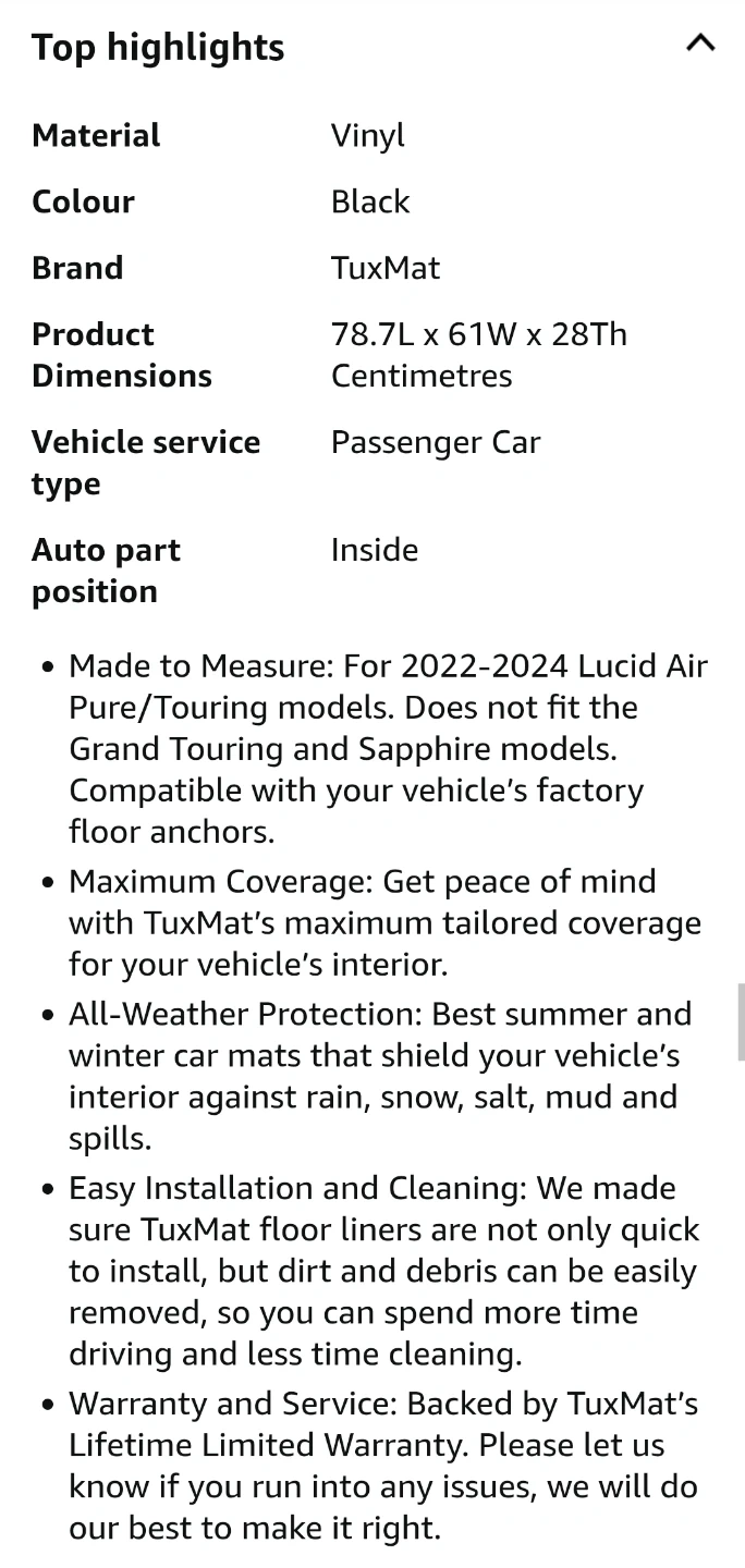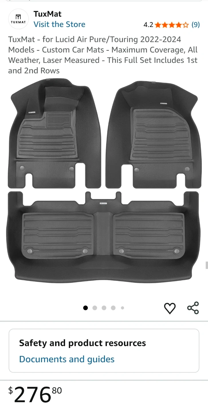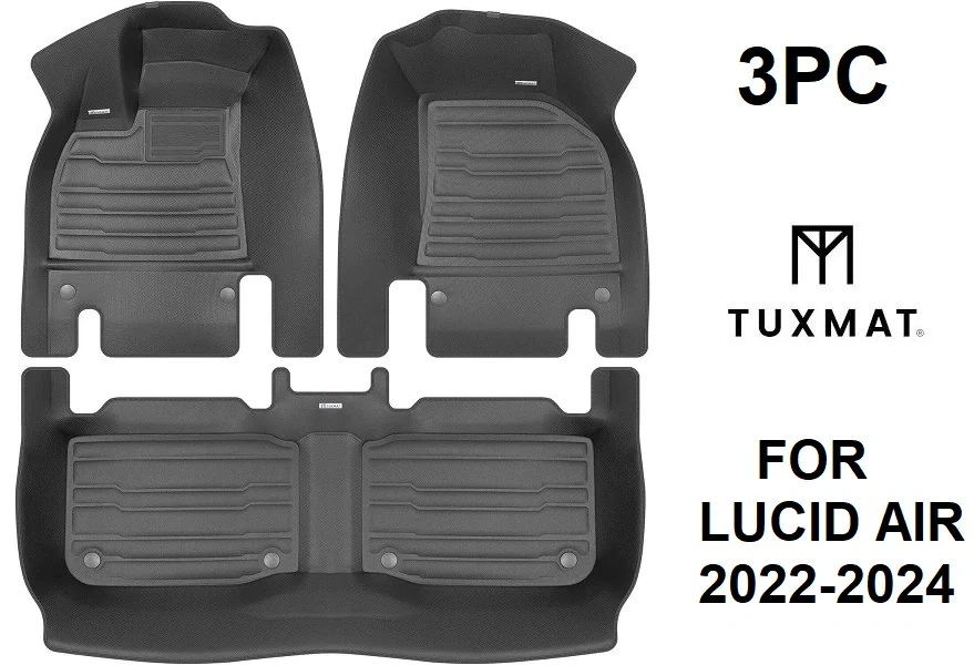 I'm selling a set of like new TuxMat floor mats designed specifically for the 2022-2024 Lucid Air Pure/Touring models. These all-weather mats offer maximum coverage and are laser-measured for a perfect fit. Note that they are not compatible with the Grand Touring and Sapphire models. They're in great condition and come with compatible factory floor anchors.