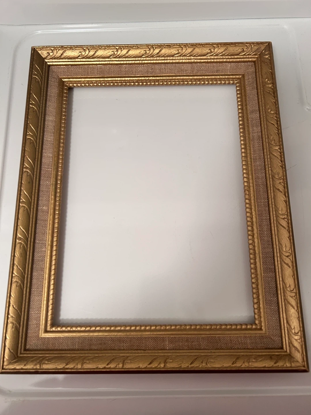 15 by 12 inch gold ornate picture frame. It features a textured linen-like insert and embossed detailing along the outer edge. This frame is ready to display your favourite photo!