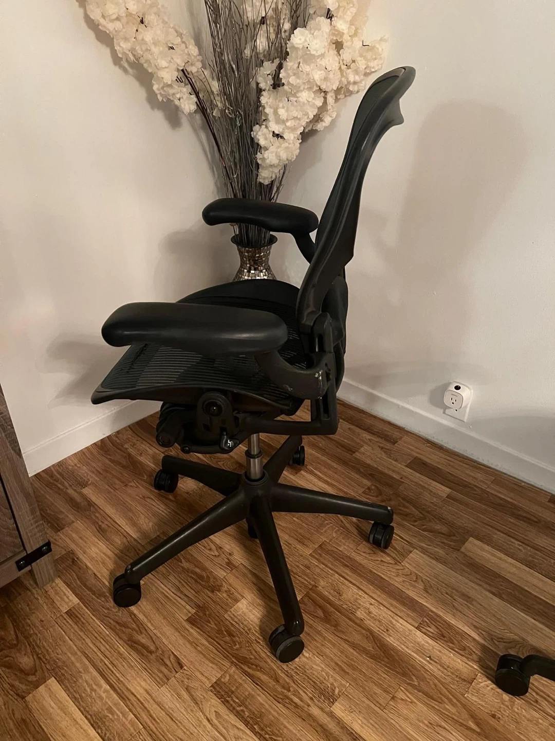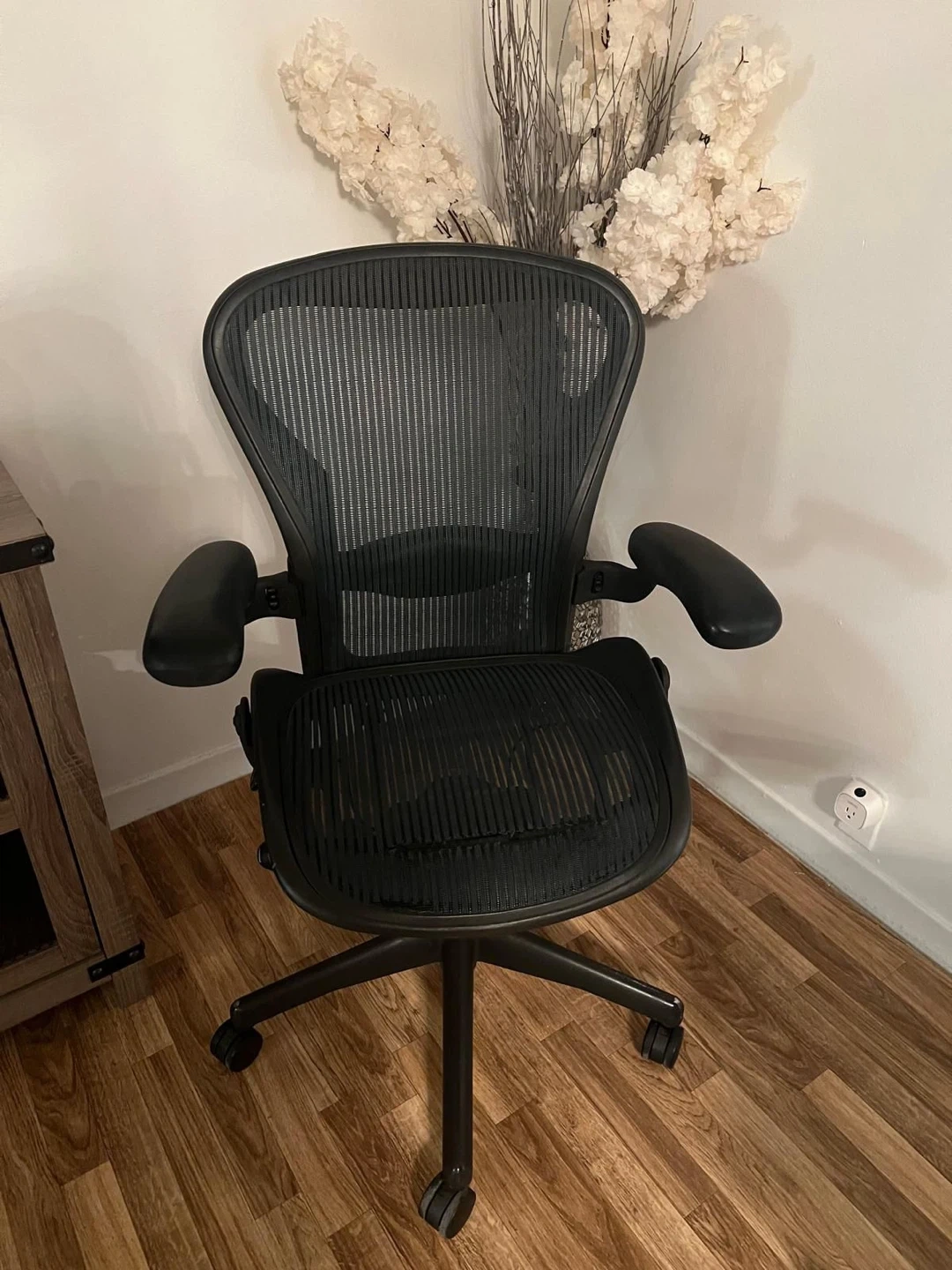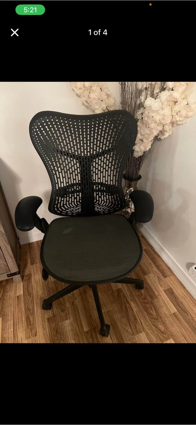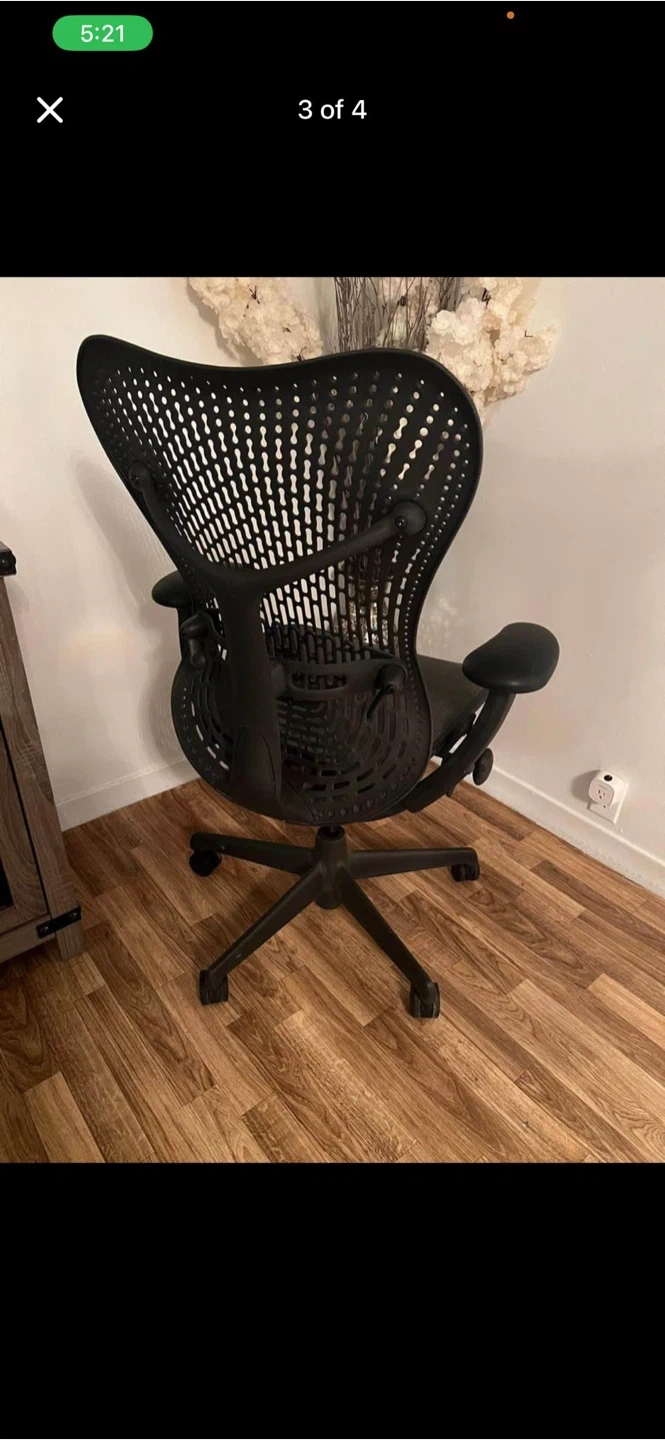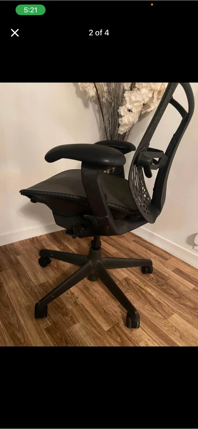 Selling a Herman Miller Mirra chair in black. It's in good condition and has been well-maintained. Perfect for your home office!