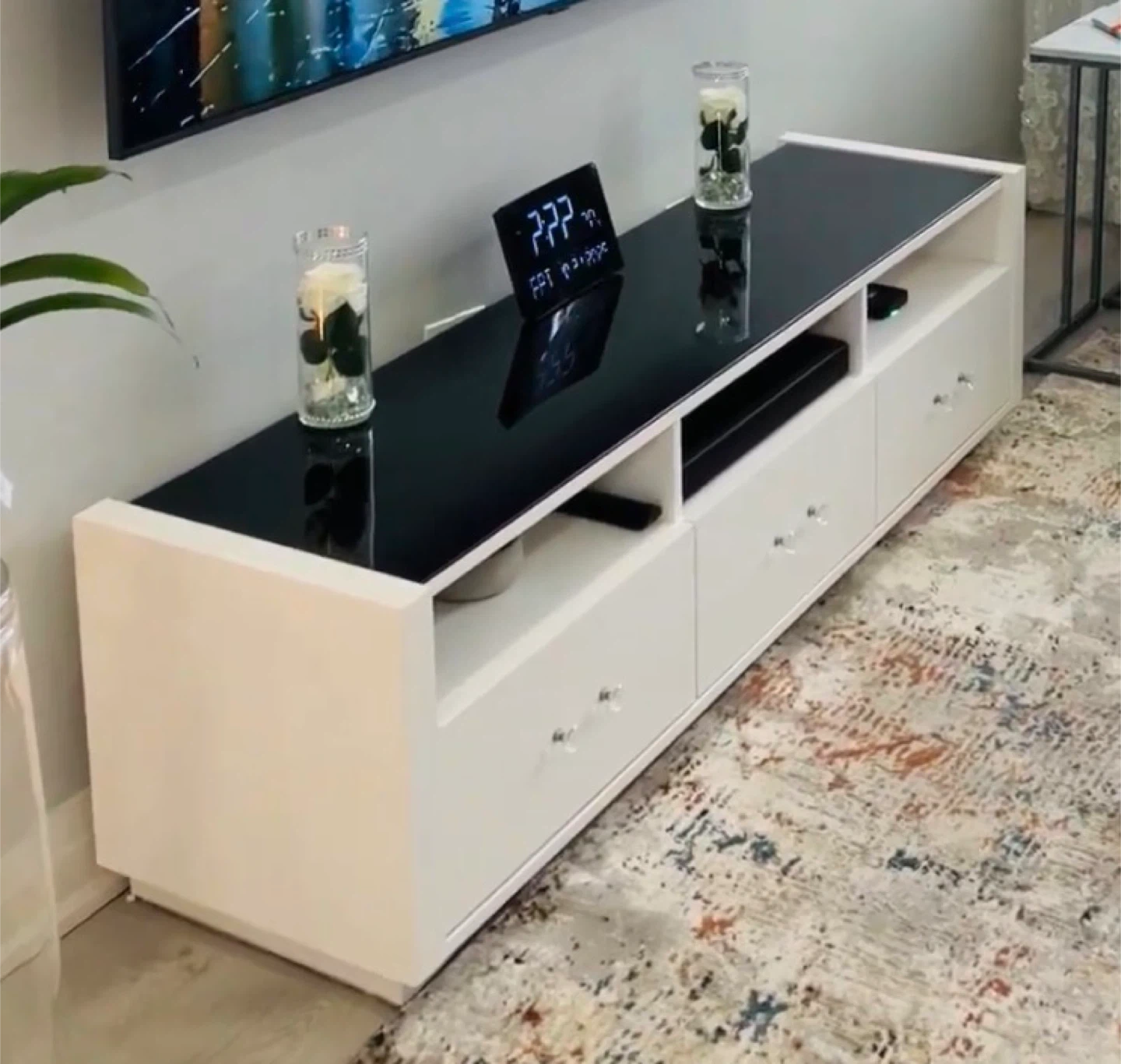 A tv stand modern white media console featuring a sleek black glass top. It includes multiple drawers with crystal-like knobs for storage. This unit has open shelving perfect for electronics.