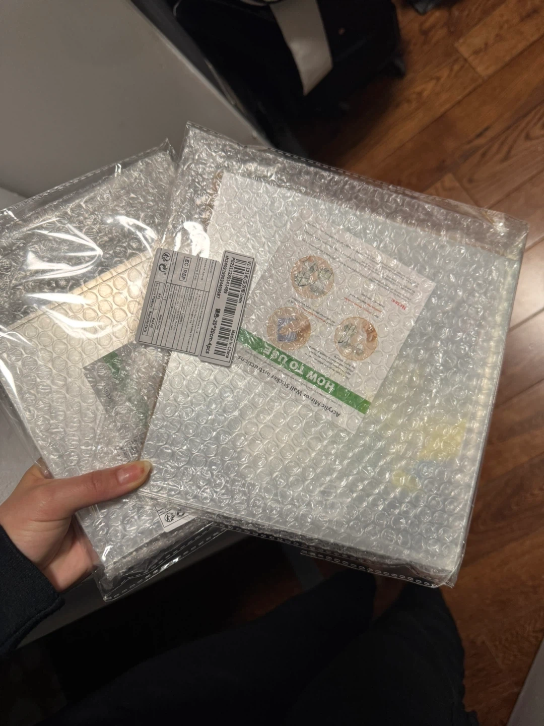 Set of four acrylic mirror wall stickers. Each sticker measures 20cm by 20cm. Includes instructions on how to use. Made in China.