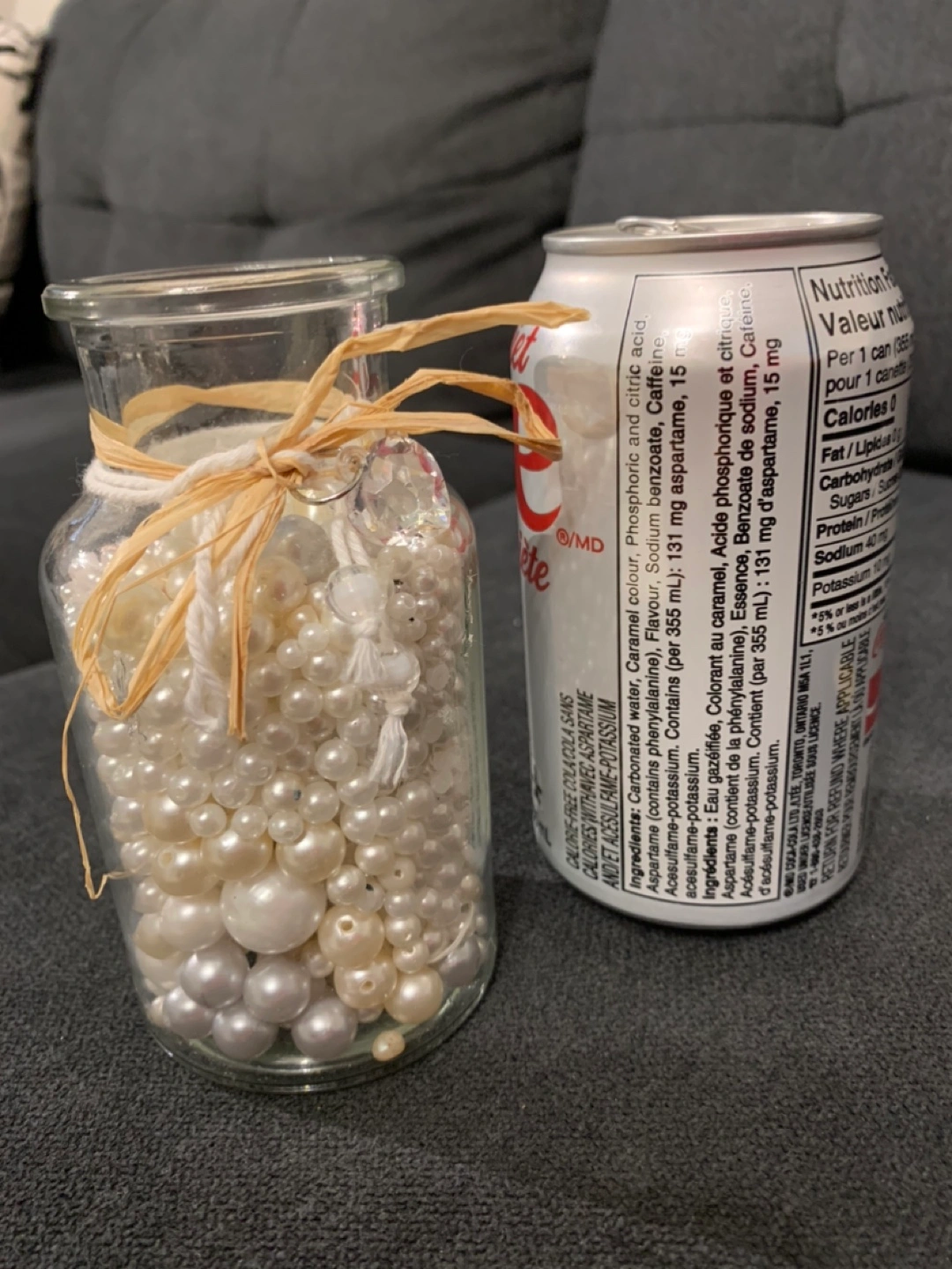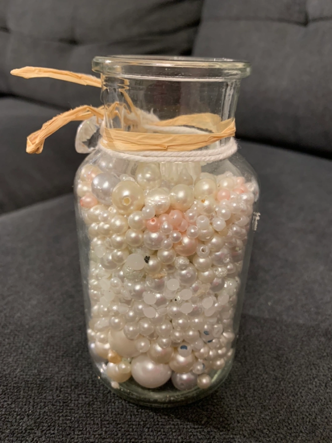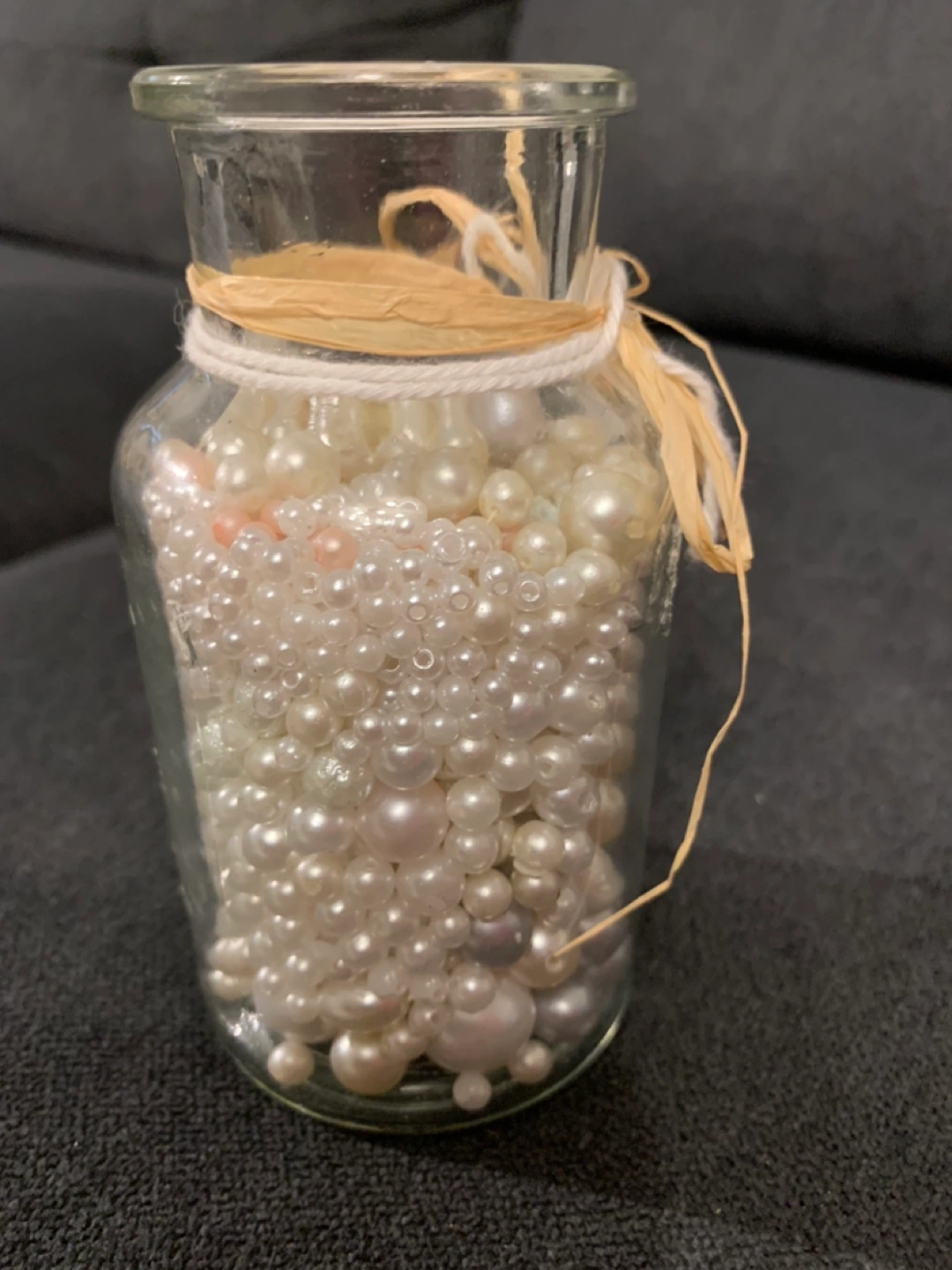 Glass jar with a variety of faux pearl beads. Various sizes and colours. Perfect for decoration, gifts, or craft projects.