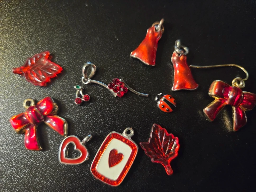 A collection of assorted red charms for crafts or jewelry making. Includes two red bows, two red leaves, a ladybug charm, a pair of red cherries with a green accent, a heart charm, a playing card charm, and two red trumpet-shaped charms. These charms are made of metal with enamel detailing.