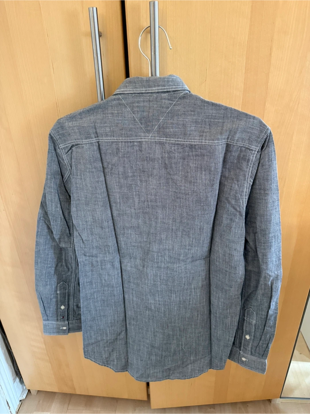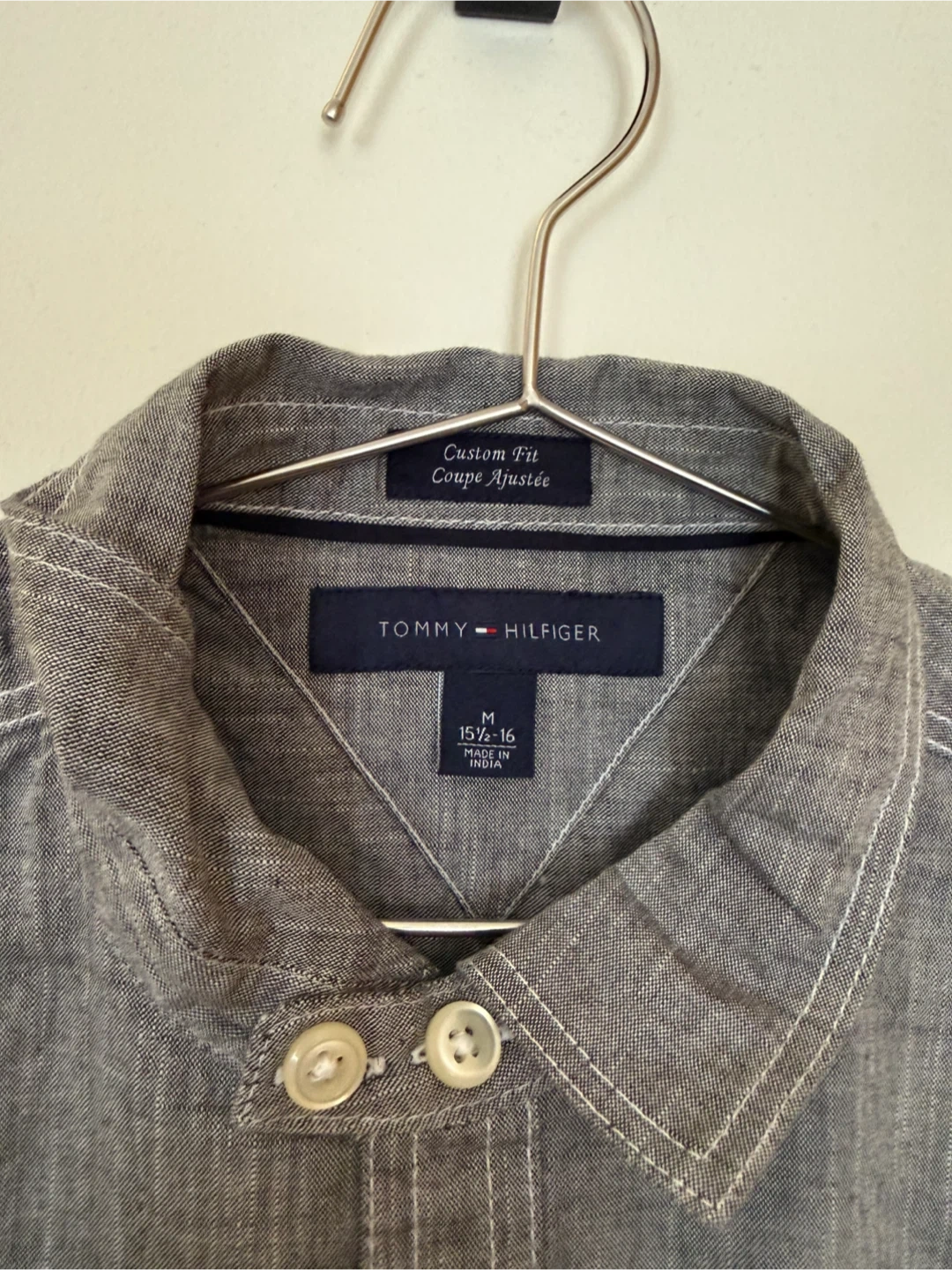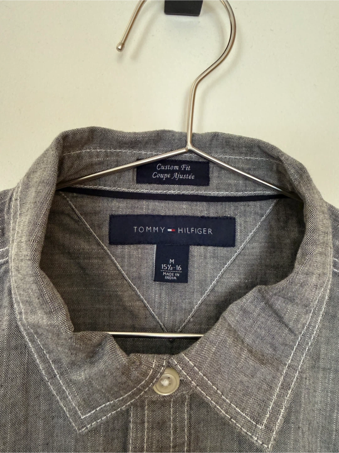 New Tommy Hilfiger custom fit long sleeve button-up shirt. It's grey with a textured weave and white contrast stitching. Features two chest pockets.
