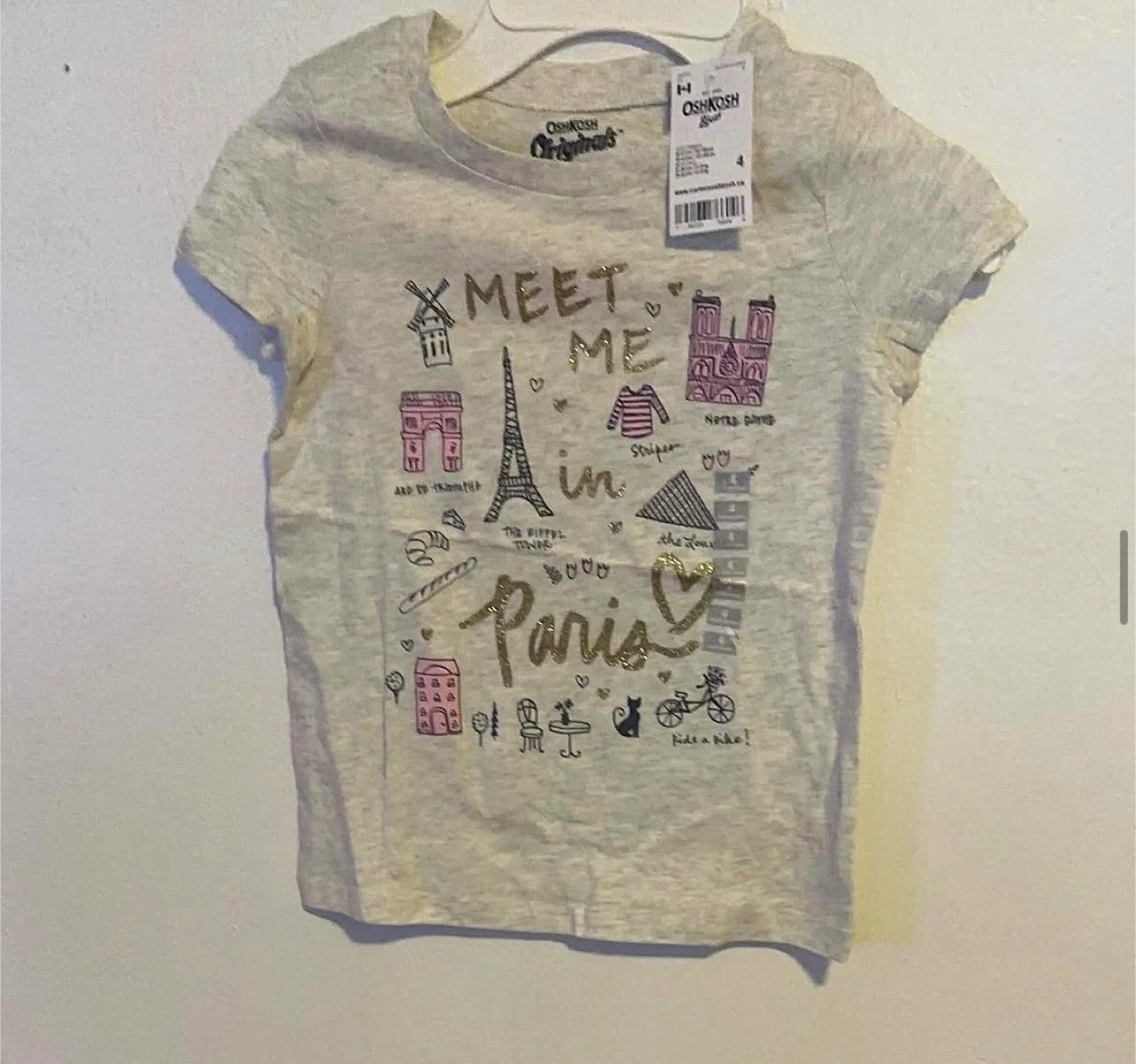 Grey OshKosh B'gosh t-shirt with a 'Meet me in Paris' graphic featuring iconic Parisian landmarks and playful drawings. It's a size 4. This tee is perfect for any little one who loves travel or art!