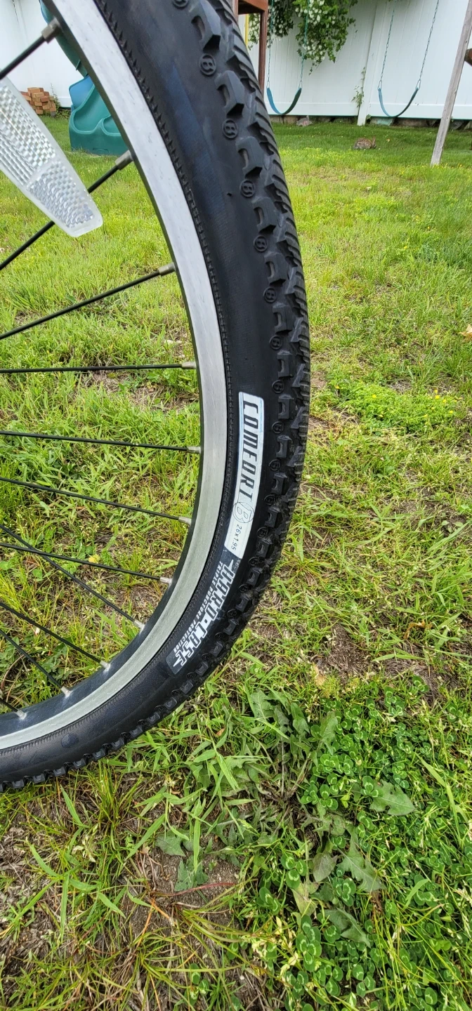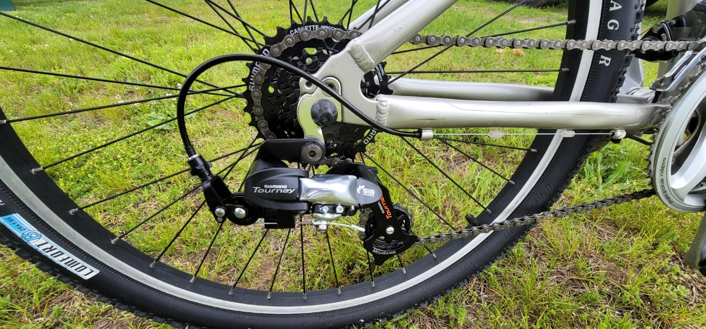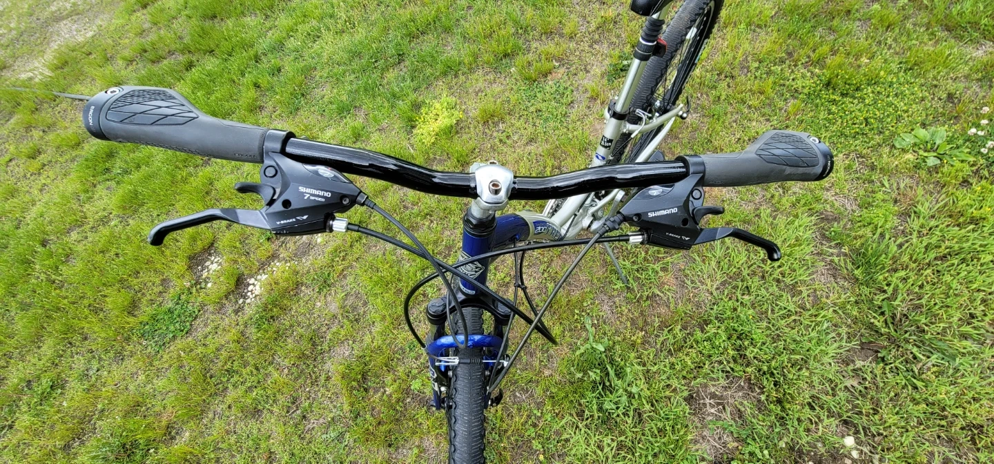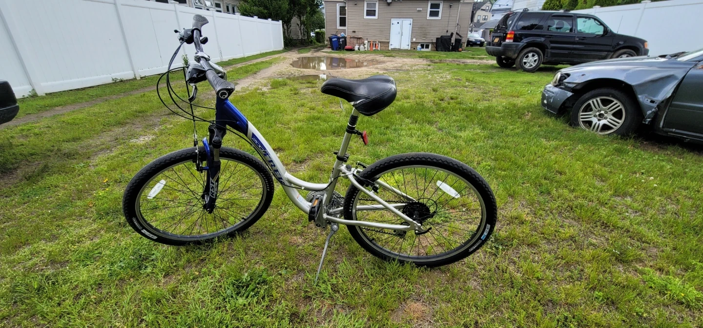 This is a Trek mountain bike with a blue and silver frame. It has Shimano 21speed gears and comfort tires. It's a great bike for trails or casual rides! Fully rebuilt with some new parts