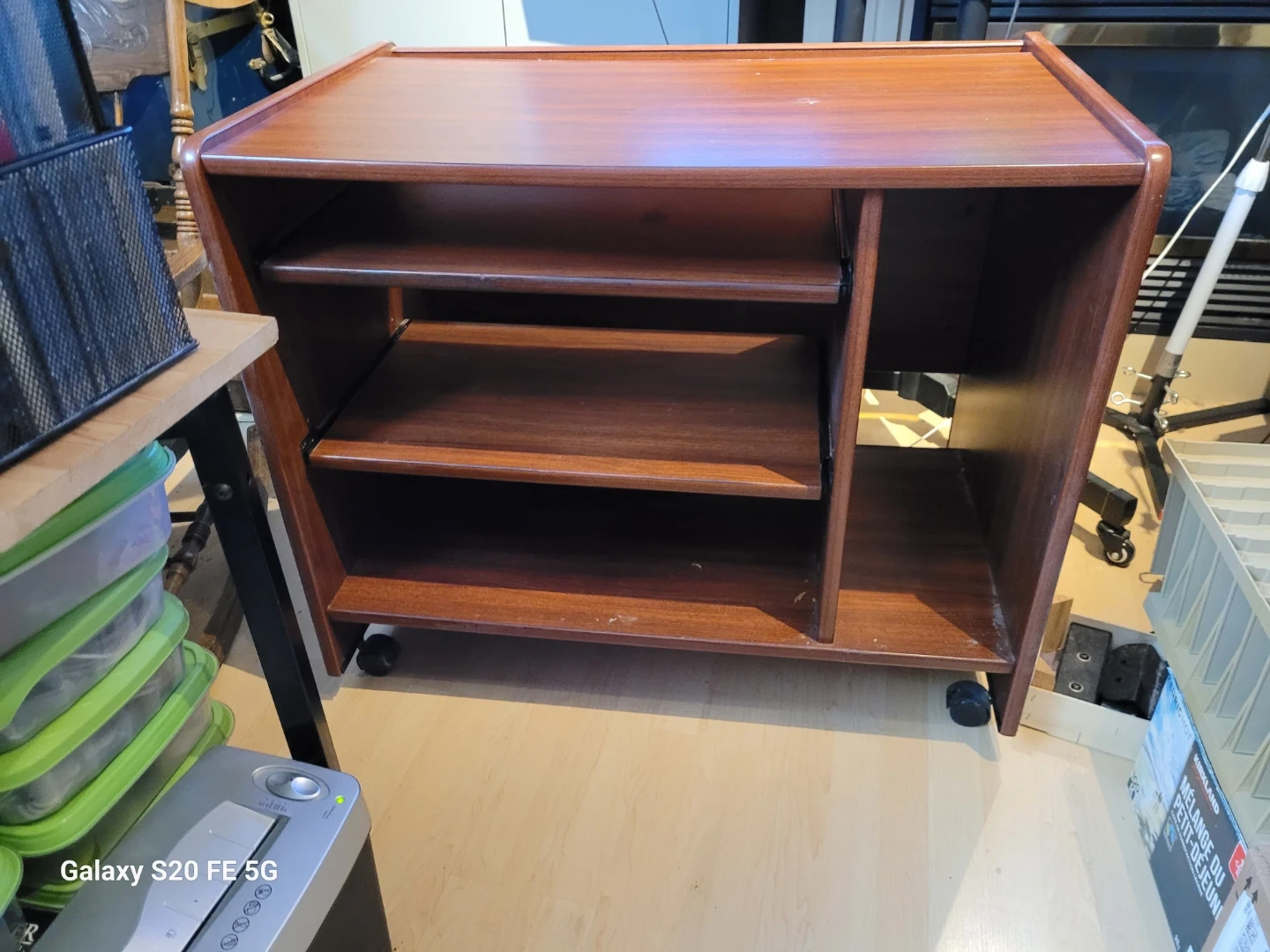 This is a dark brown wooden media stand with multiple shelves. It's mounted on four small wheels for easy movement. It has three open shelves on the left side and an open compartment on the right. It's great for storing electronics or other items!