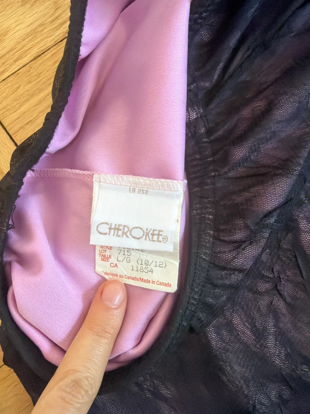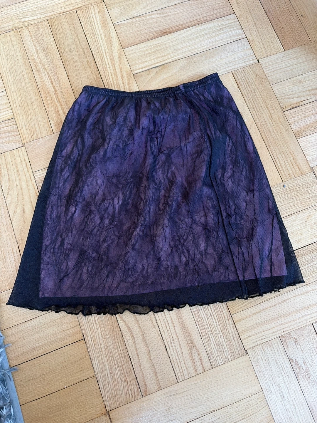 This Cherokee skirt features a unique purple, textured mesh overlay with a black sheer hem. It's fully lined with a soft pink fabric. Made in Canada.