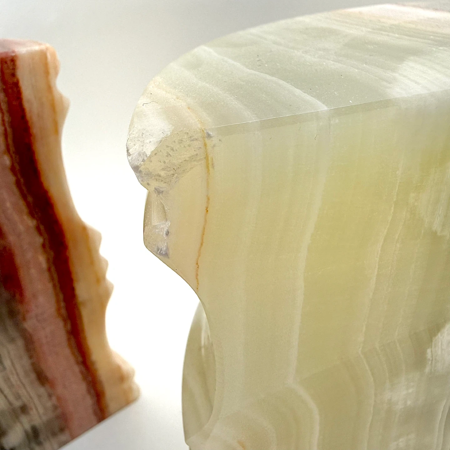 Pair of vintage large banded onyx bookends. One perfect, one has chip at top edge (see photo) but could be position out of view. They each measure 6” wide x 3” deep x 5.5” tall — very heavy