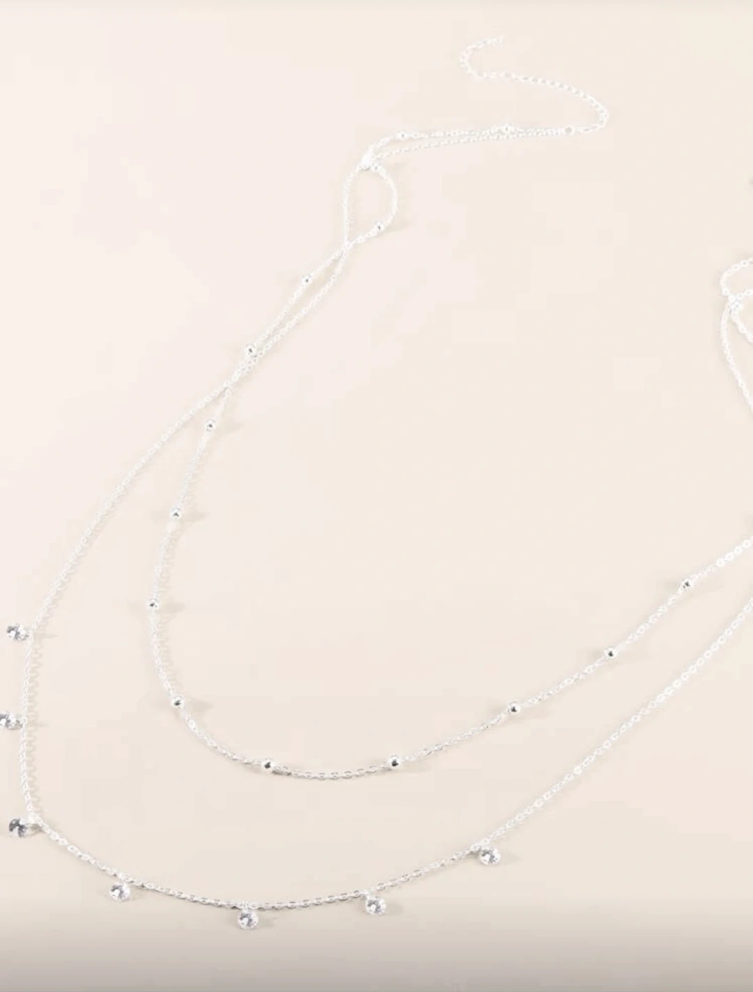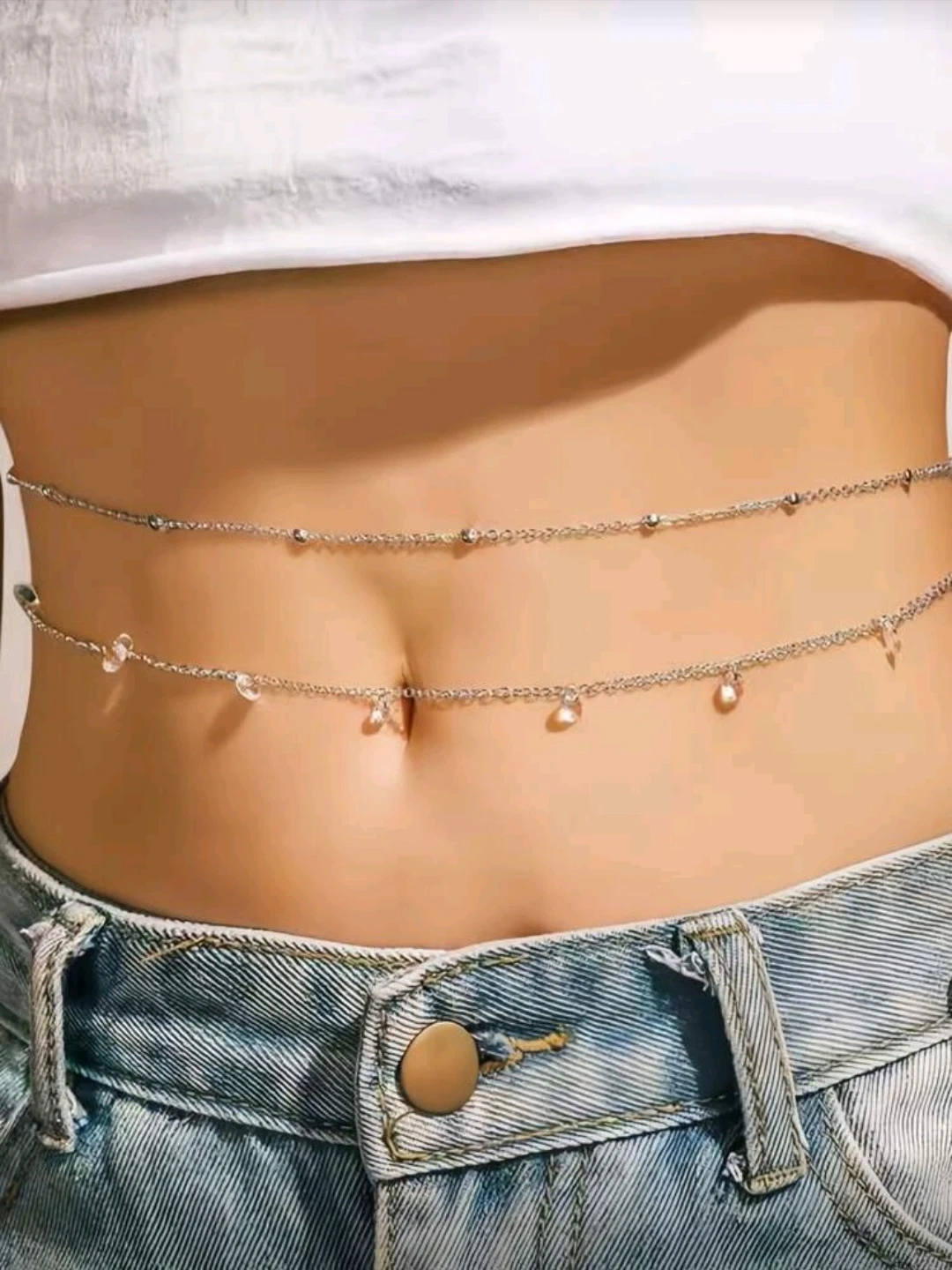This silver-toned body chain features two delicate layers adorned with small beads and sparkling charms. It's designed to be worn around the waist. It's a stylish accessory for summer outfits!