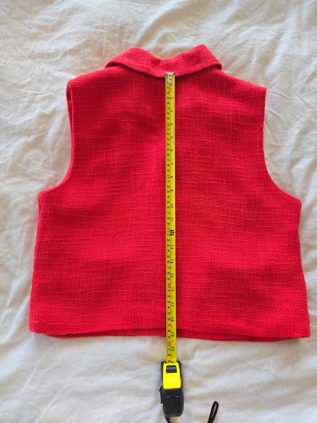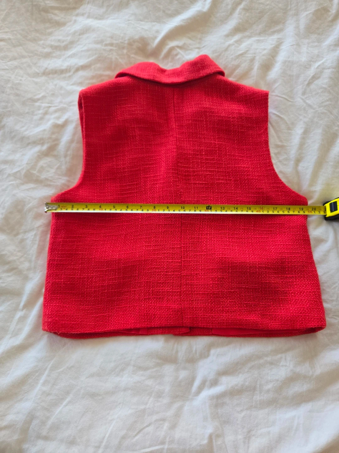 A vibrant red tweed vest from Suzy Shier. It features a collared neckline with two button closures and flap pockets.