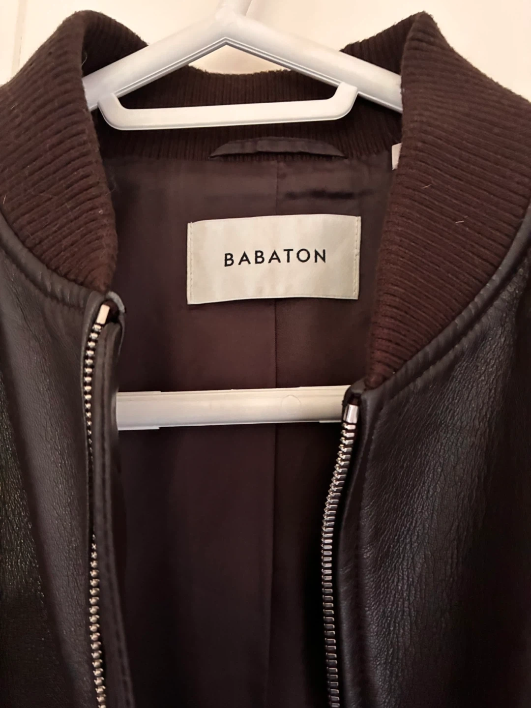 This Babaton bomber jacket is made with a polyurethane face and polyester backing. It features a polyester lining and a rib trim of polyester and elastane. The jacket is dark brown and has a classic bomber silhouette.