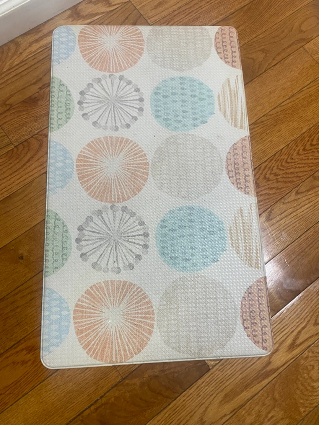 This mat has a fun, colorful bubble pattern on one side and a solid gray on the other. It's perfect for your home creating a soft surface. Durable material.leather material you can use both side easy to clean no need laundry.