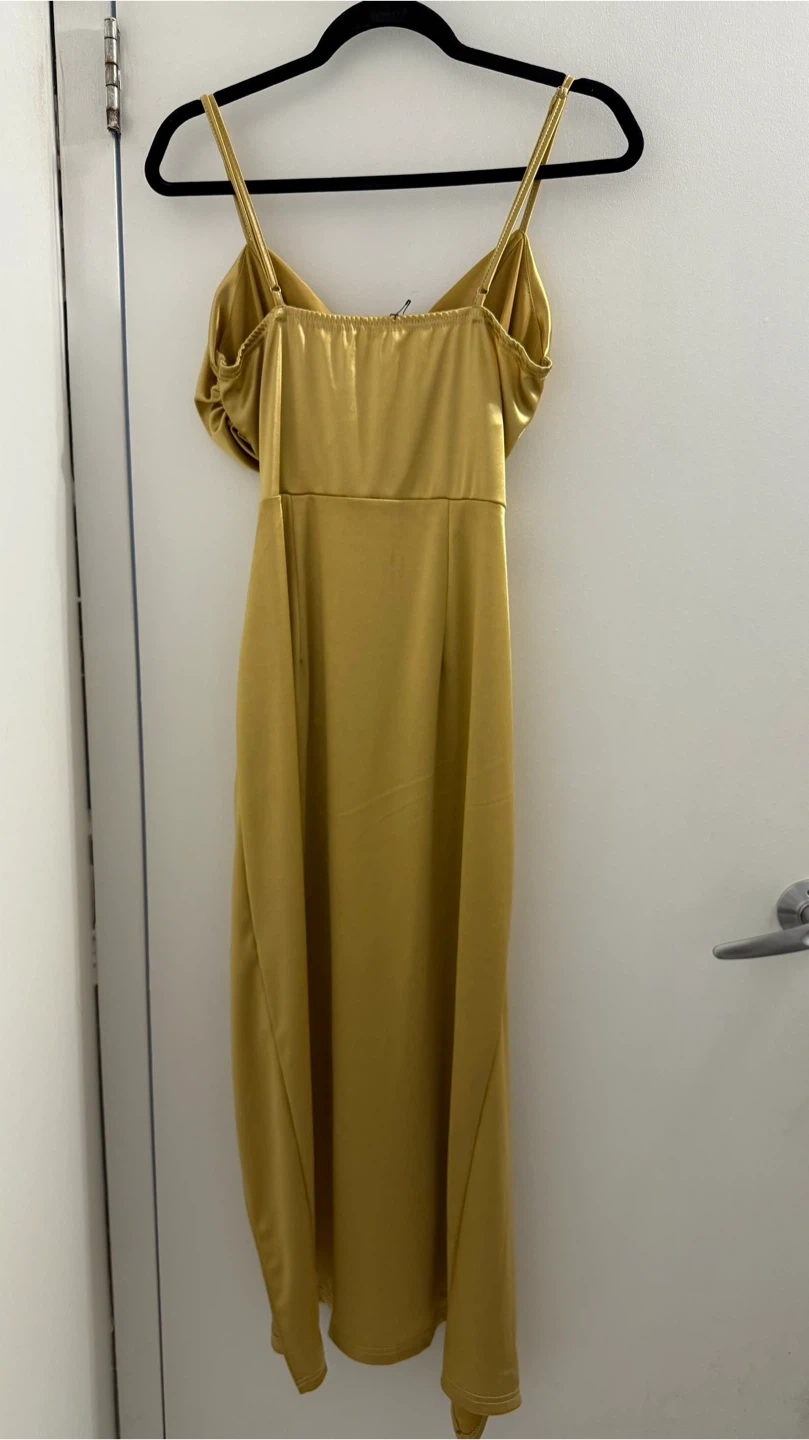 This stylish gold satin midi dress features a flattering ruched detail on the front. It has adjustable spaghetti straps and a sweetheart neckline. It's perfect for a night out or a special occasion!