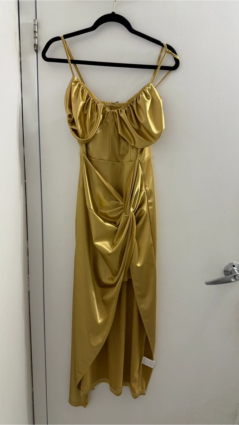 Gold Satin Ruched Midi Dress