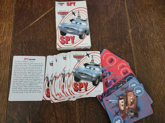 Dive into the world of espionage with this Disney Pixar Cars Spy card game! This used card game features Finn McMissile and other beloved characters. The box shows some wear, but all the cards are included and ready for action. Perfect for family game night or for collectors. Get ready for hours of fun and intrigue! If the ad is up, the cards are still here, ready to be dealt into your hands. Don't miss out on the chance to add a bit of Cars excitement to your life!