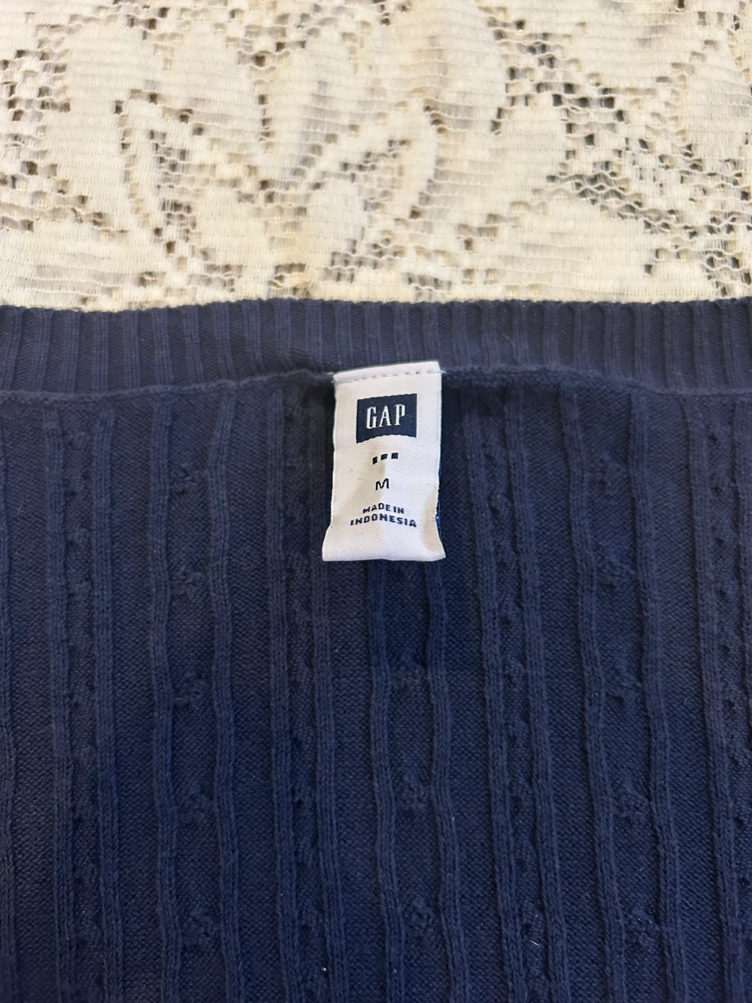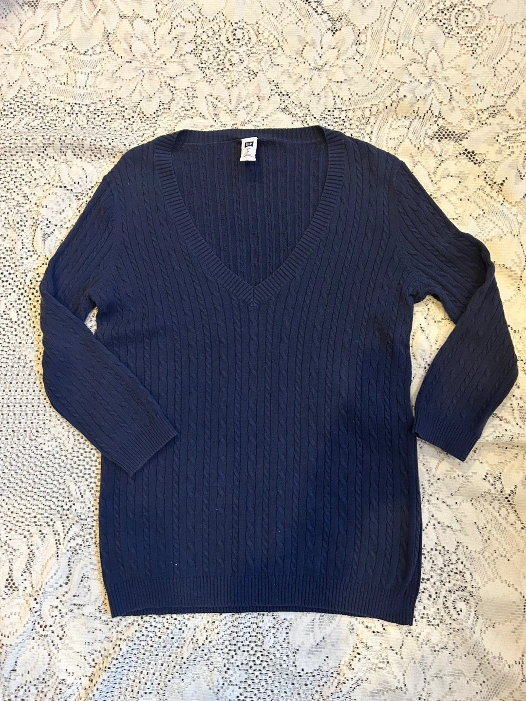 Cozy up in this lovely blue V-neck sweater from GAP! It's a size medium and features a classic cable knit design. Perfect for layering or wearing on its own on those cooler days. The material is soft and comfortable, making it a great addition to your wardrobe