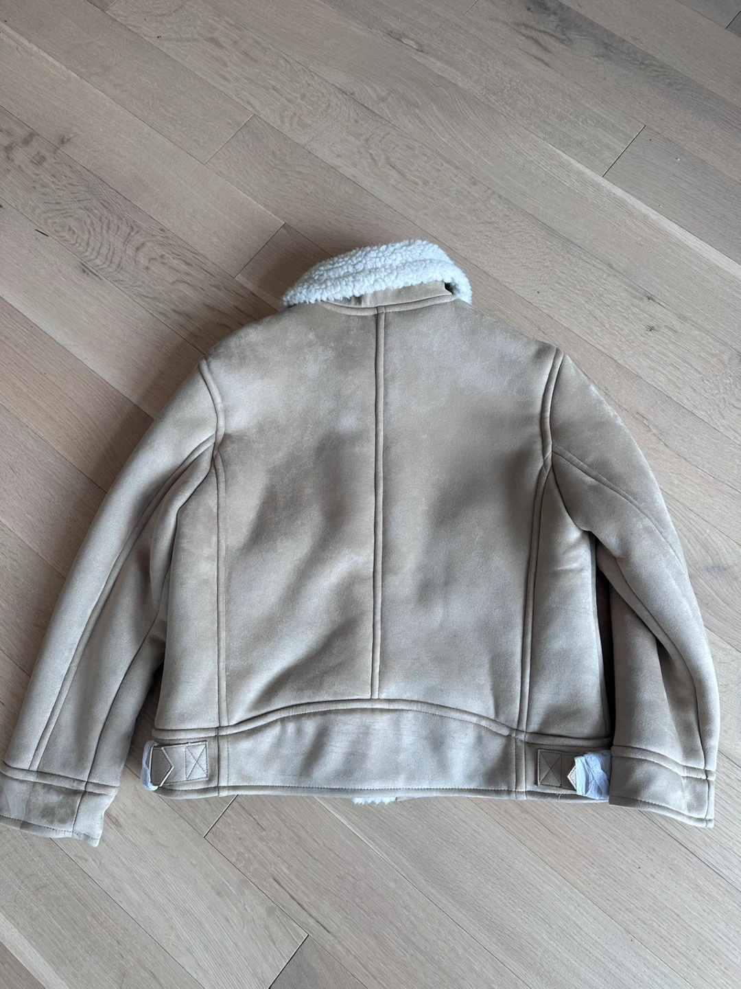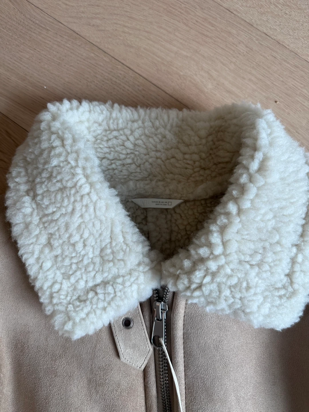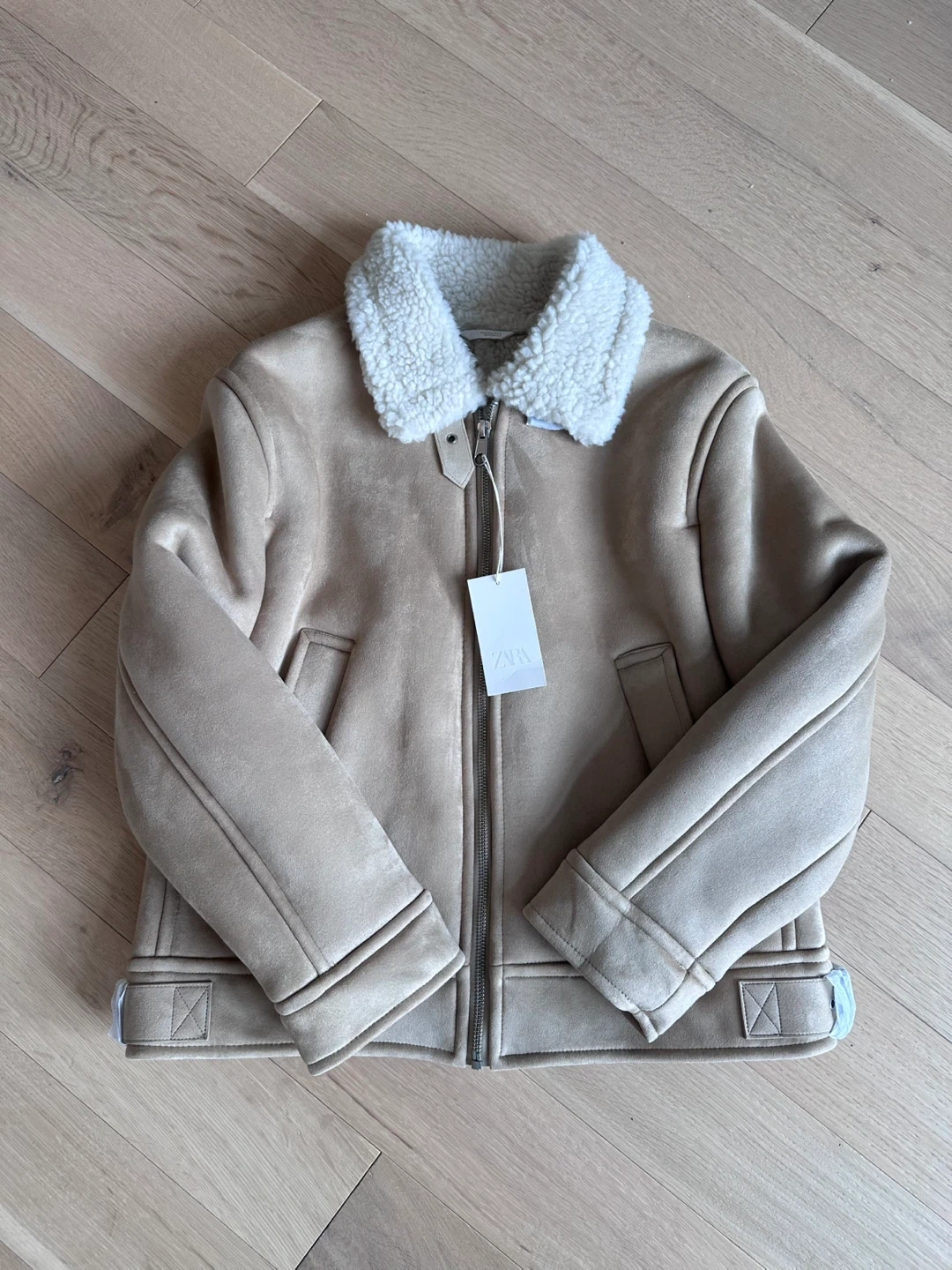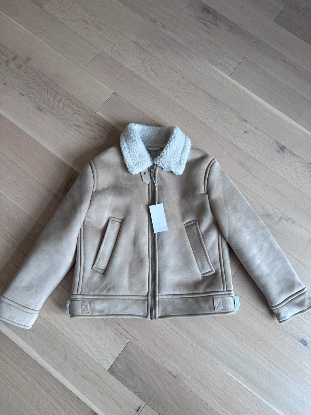 A cozy faux suede jacket with a warm sherpa lining and collar. It's a stylish beige colour and zips up the front. Includes two side pockets and adjustable straps at the hem.