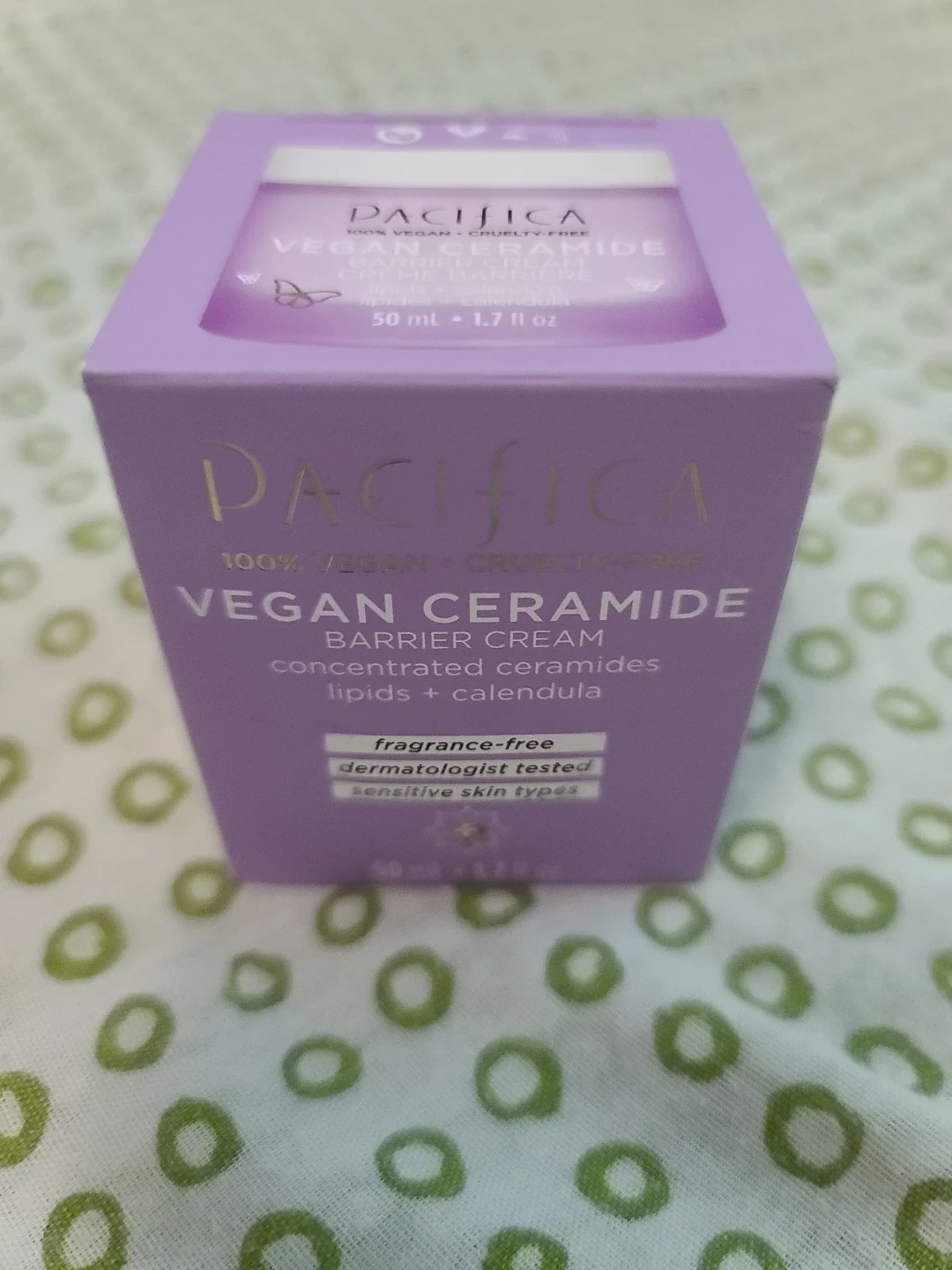 Pacifica 100% vegan, cruelty-free barrier cream. Concentrated ceramides, lipids, and calendula. It's fragrance-free and dermatologist tested for sensitive skin types.
