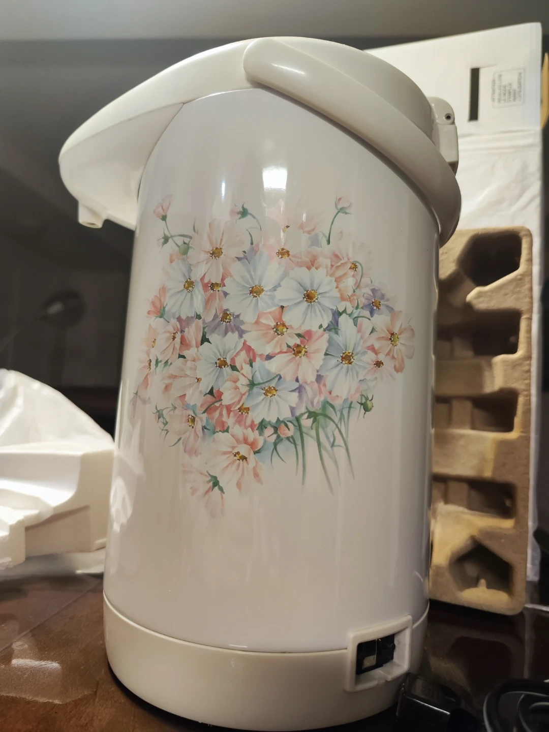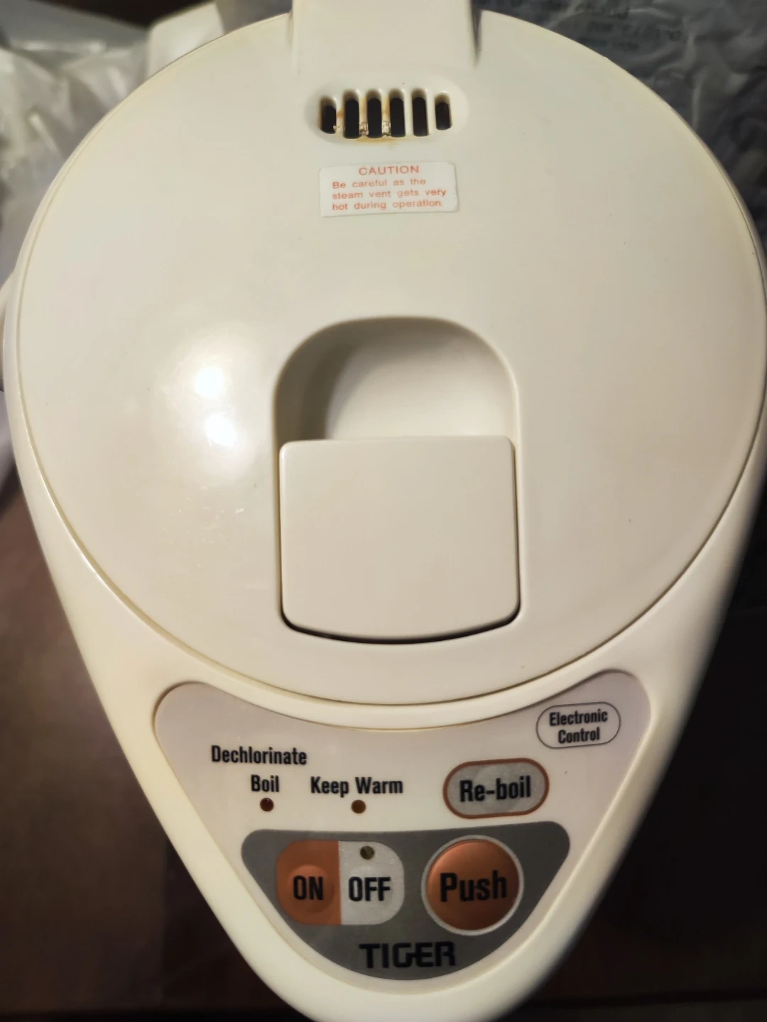 This Tiger electric water boiler thermos is perfect for keeping water hot. It features electronic control with functions like Dechlorinate, Boil, Keep Warm, and Re-boil. It has a clear water level indicator on the side. Ideal for busy households needing instant hot water!