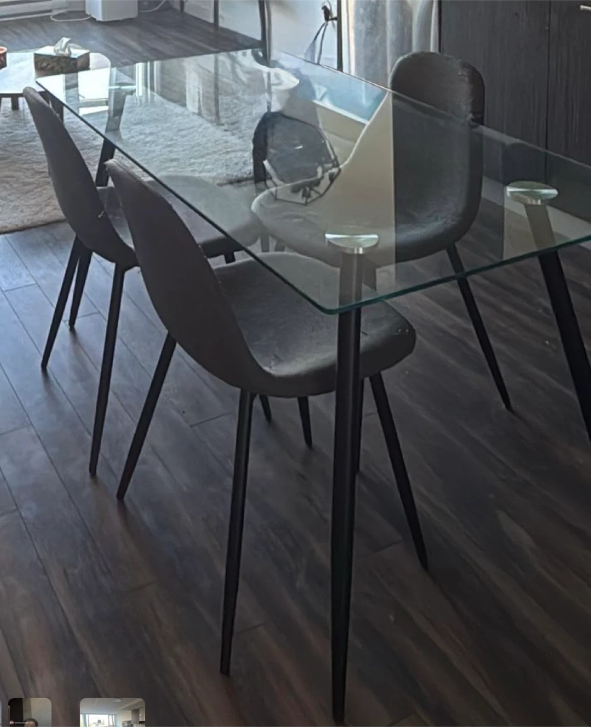 Modern glass-top dining table. It's designed with sleek black metal legs for a contemporary look. Seats four comfortably. Perfect for smaller dining spaces!