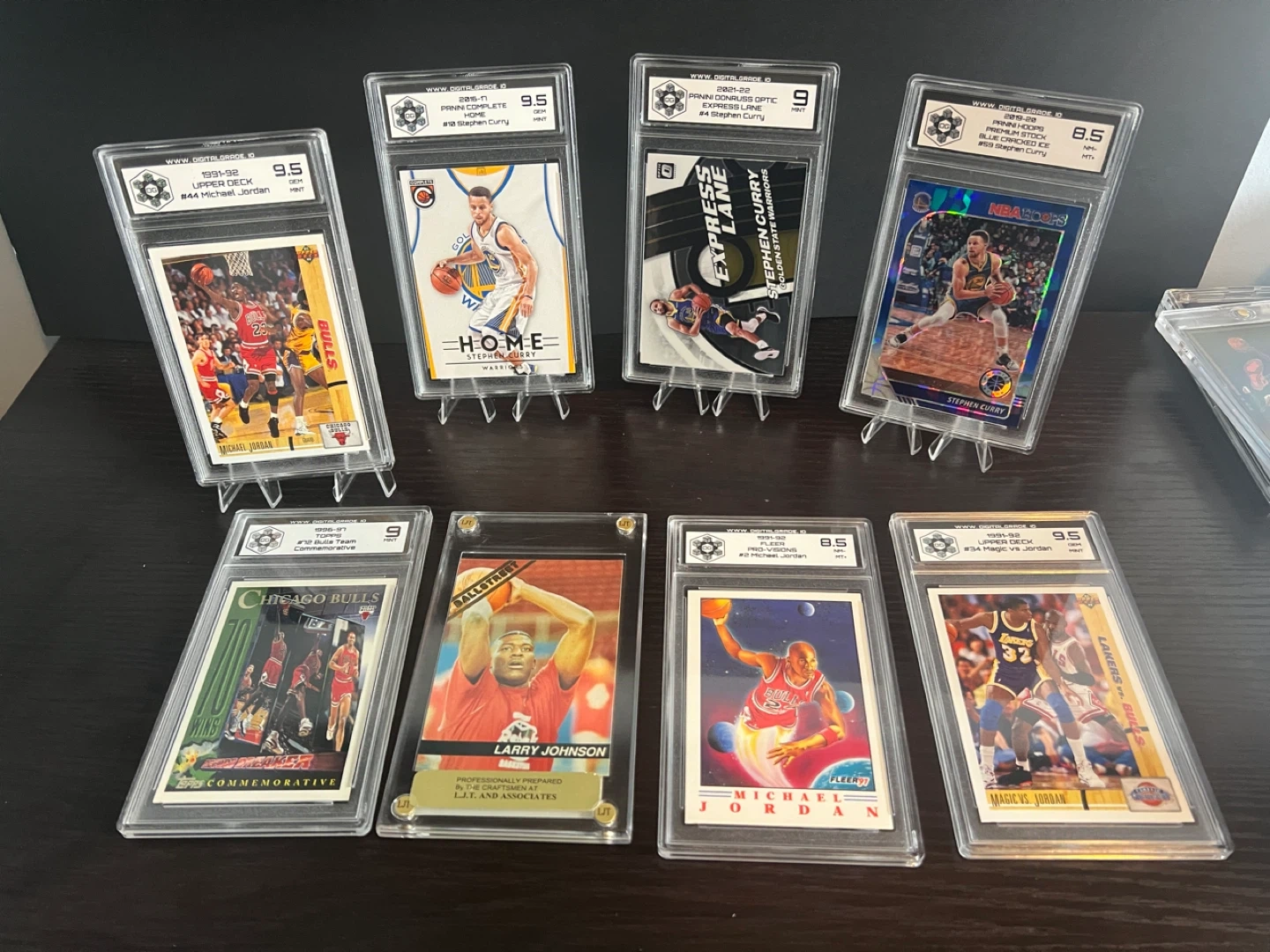 Multiple cards shown across the photos — including Michael Jordan, Steph Curry, and other stars.