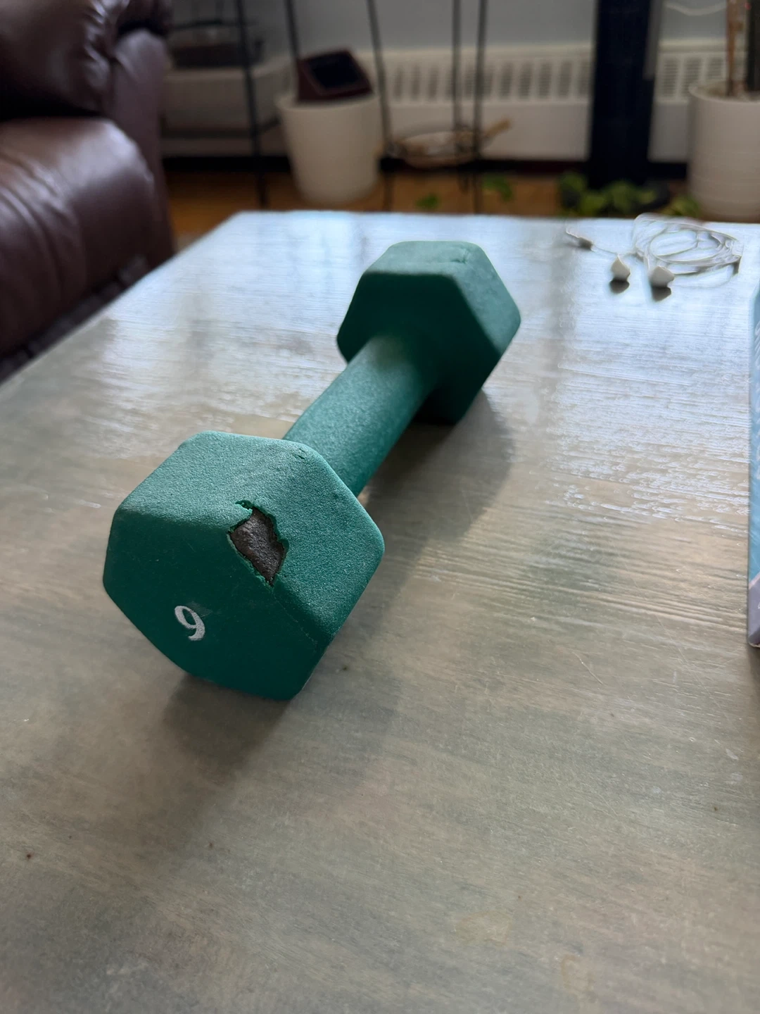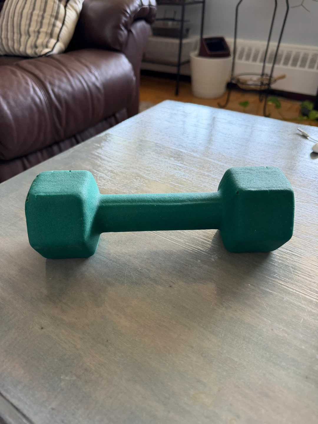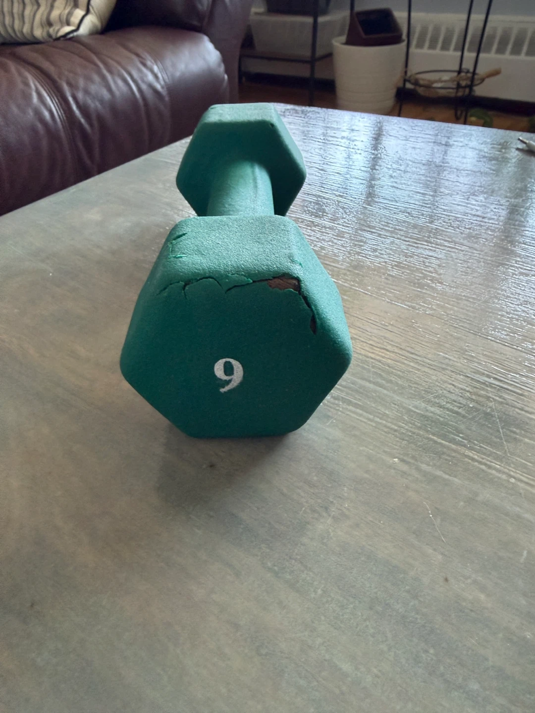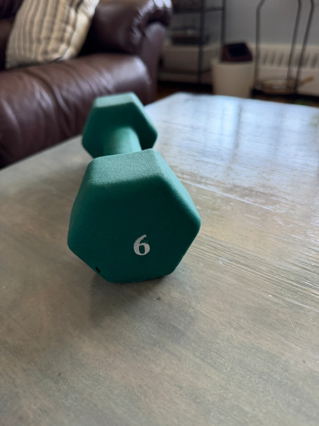 This green dumbbell is marked as 6lb. It's covered in a matte coating for a good grip. There's some minor damage to the coating on one end, as shown in the pictures. Great for home workouts!