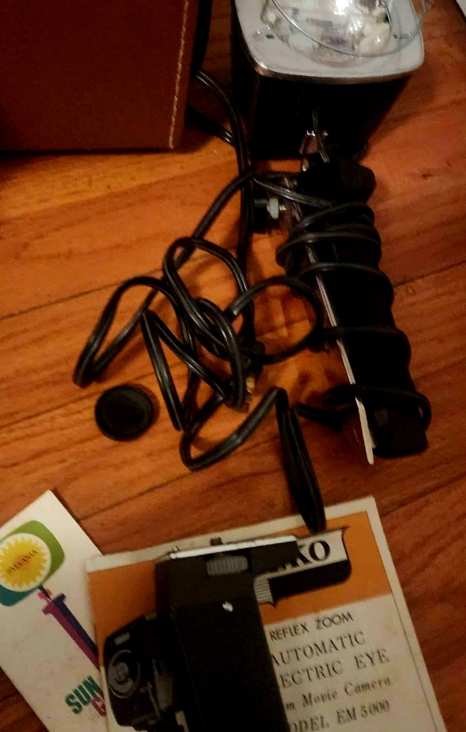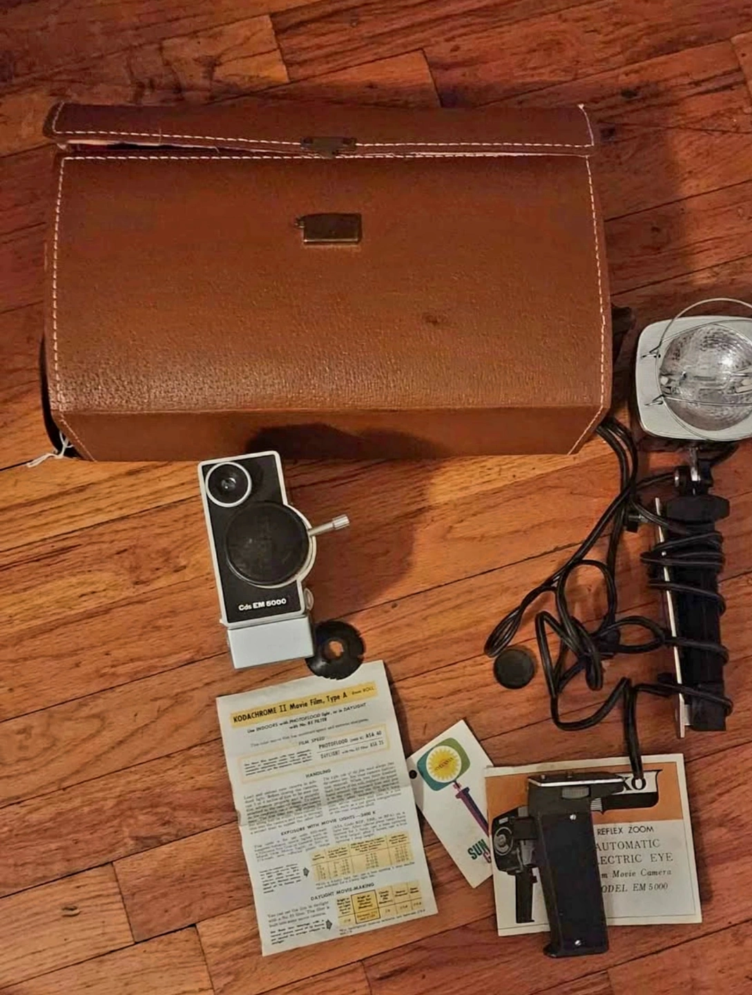 Vintage Bolex EM 5000 8mm movie camera kit. Includes camera, carrying case, and flash unit. Instruction manuals included. Great for collectors.