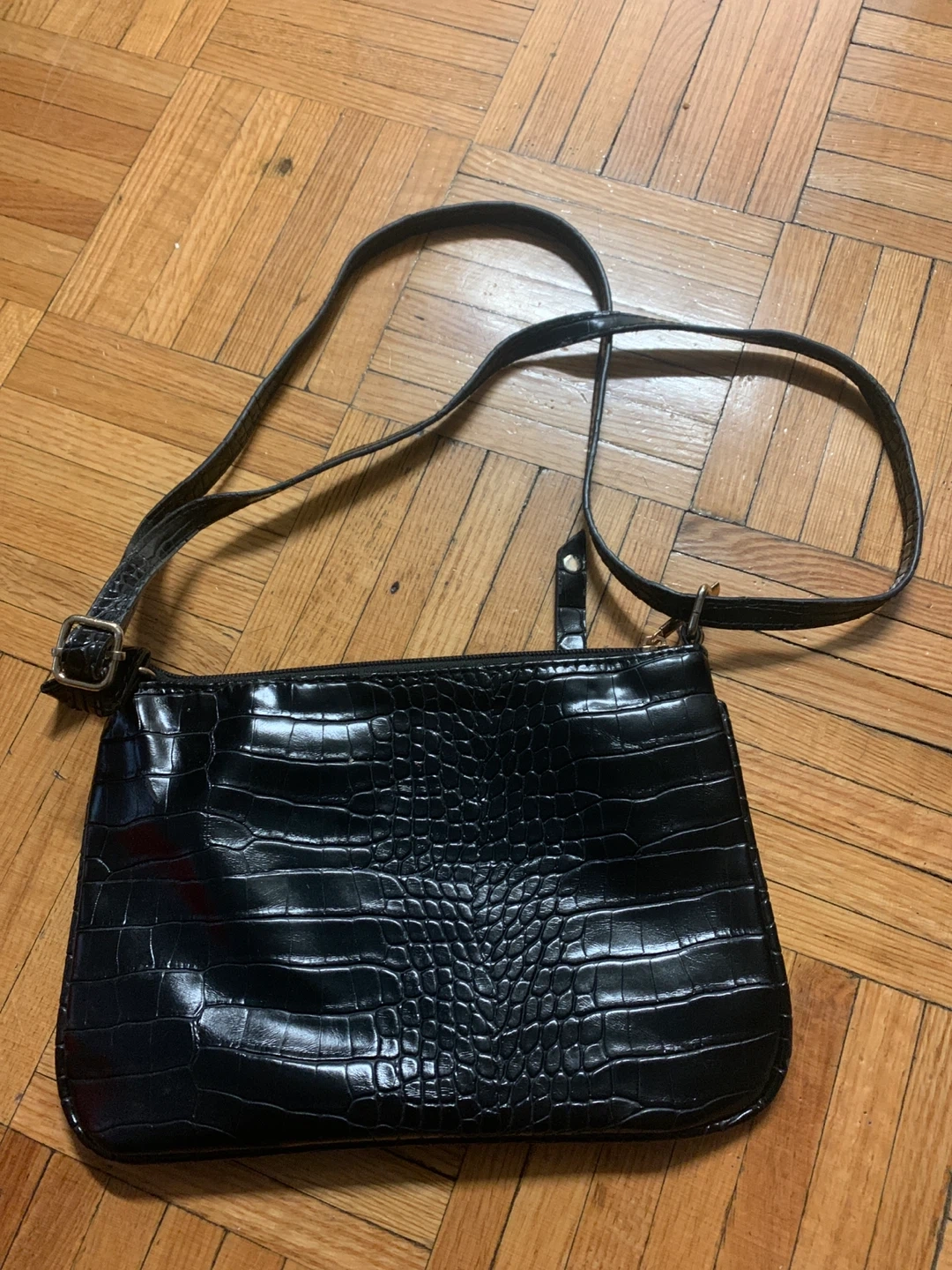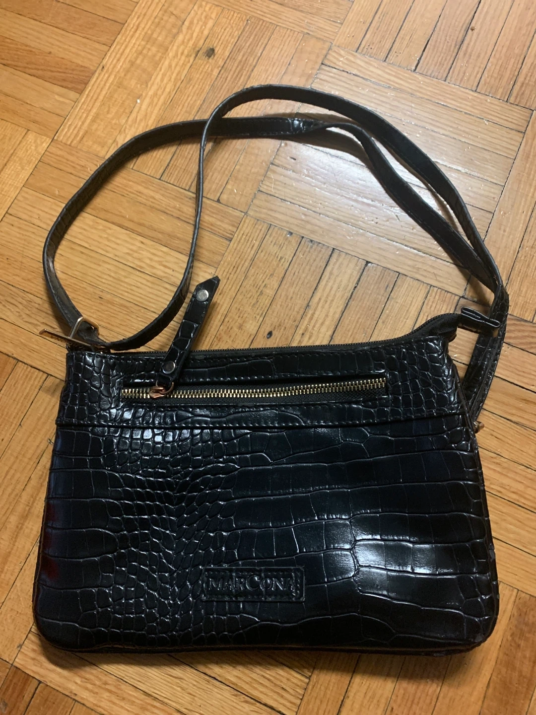 This Marcona shoulder bag features a black crocodile embossed exterior. It has a zip-top closure and an adjustable shoulder strap. Bag is made of faux leather.
