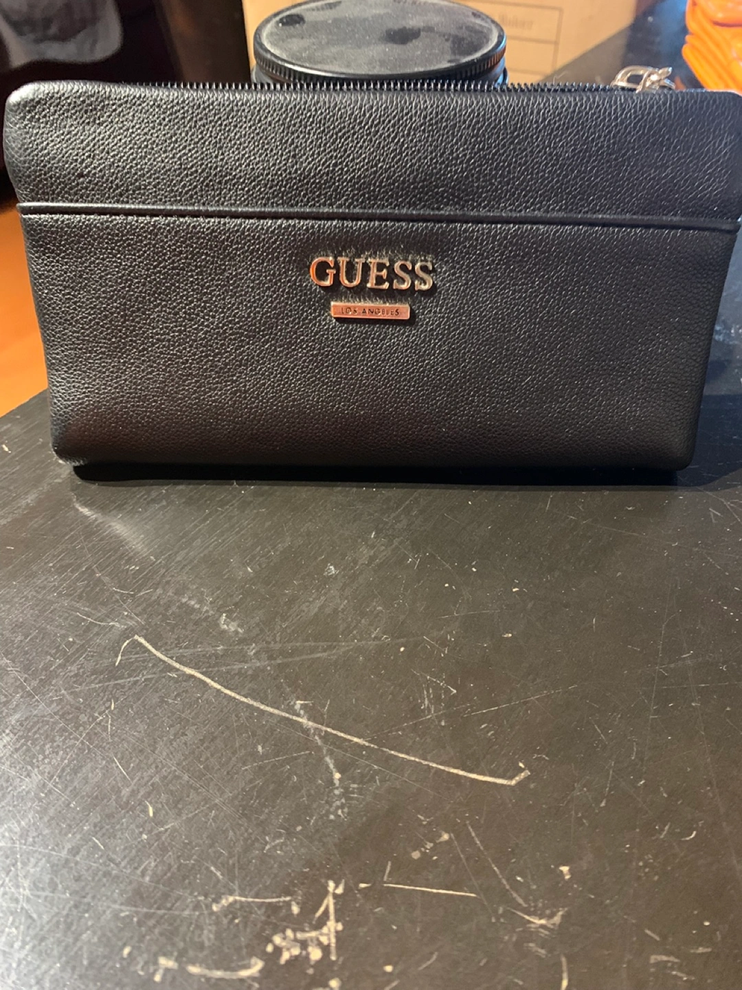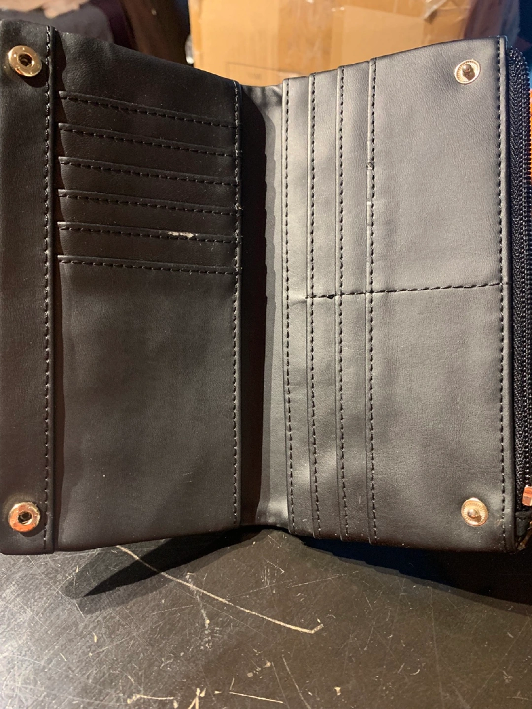 Black leather zip-around wallet. Multiple card slots and compartments. Excellent for everyday use. Zipper closure.