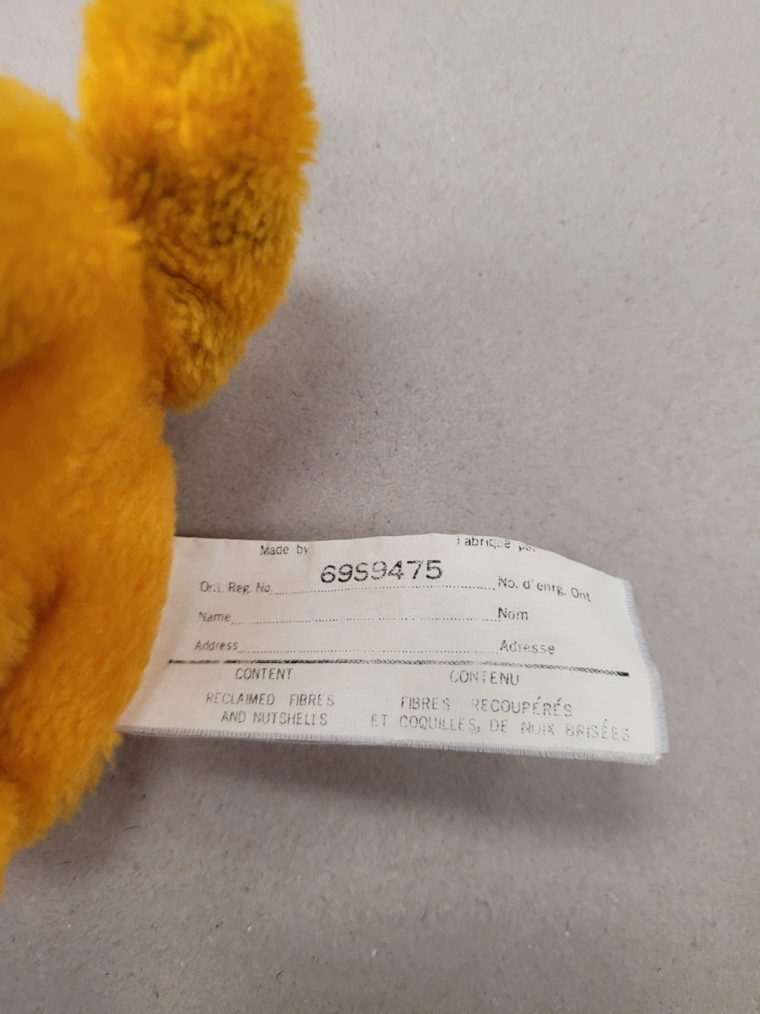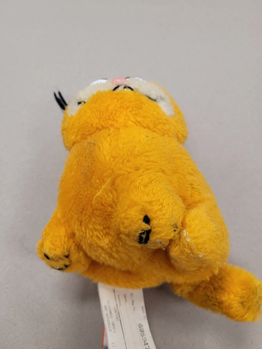 This is a vintage Garfield plush toy from 1981. It's made with a soft, fuzzy orange material. The filling consists of reclaimed fibres and nutshells.