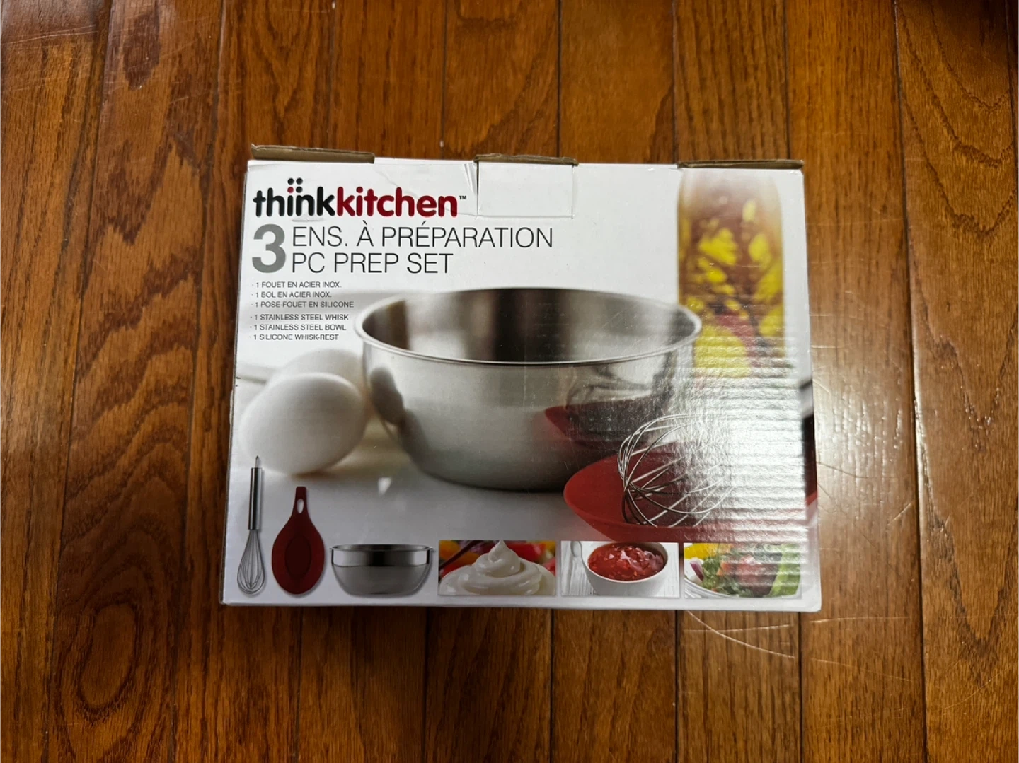 This Thinkkitchen prep set includes 1 stainless steel whisk, 1 stainless steel bowl, and 1 silicone whisk rest. All pieces are made from durable stainless steel.