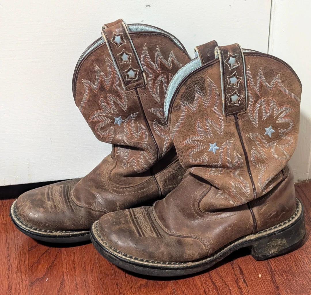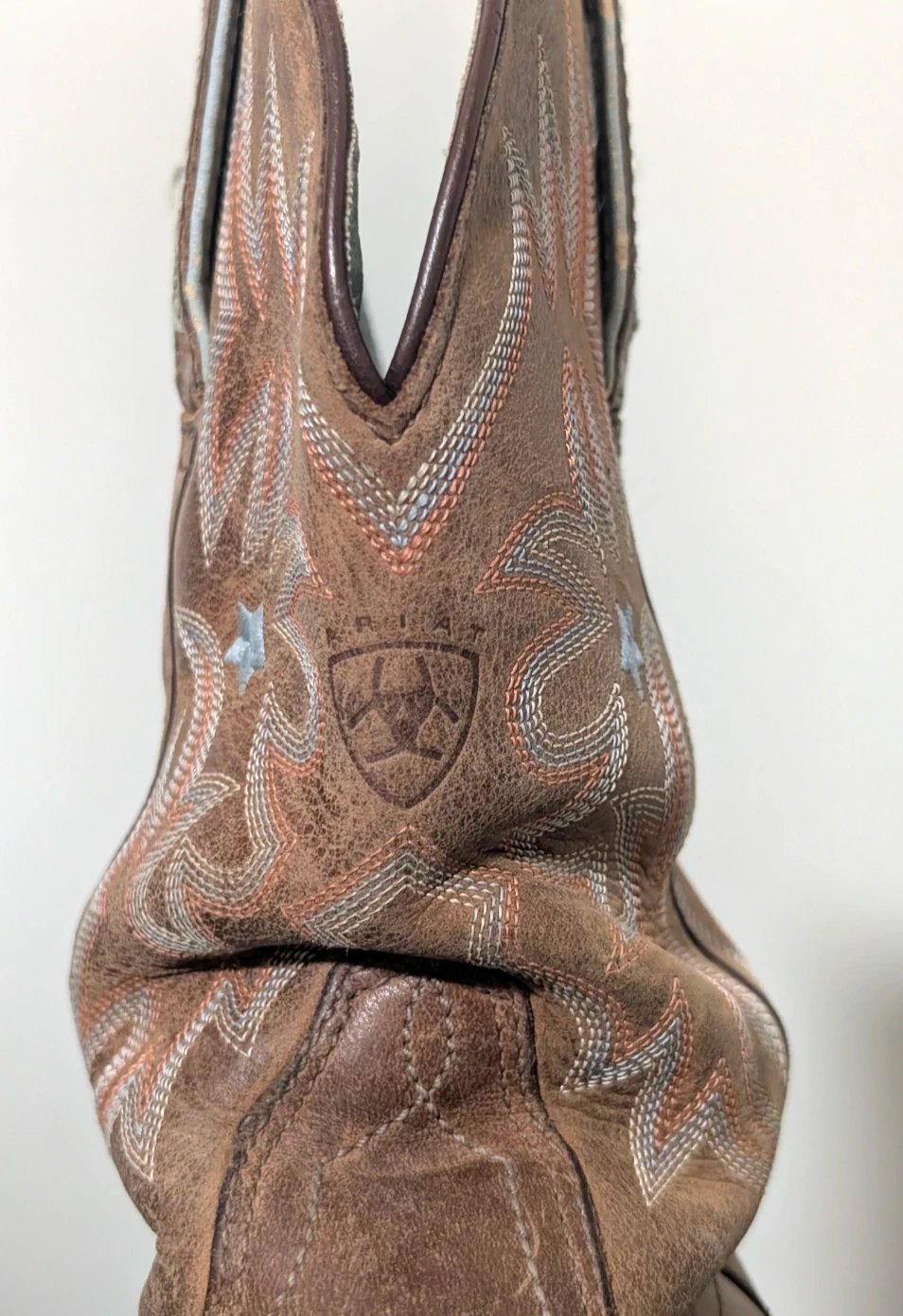 Brown leather cowboy boots with decorative stitching and star accents. Ariat branding visible on the sole and inside the boot. Size 6B.