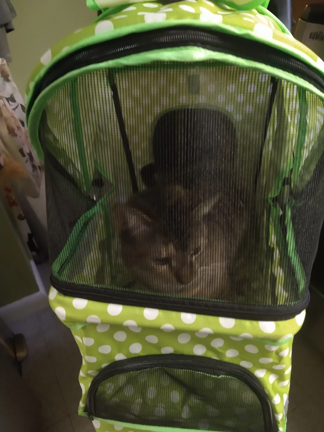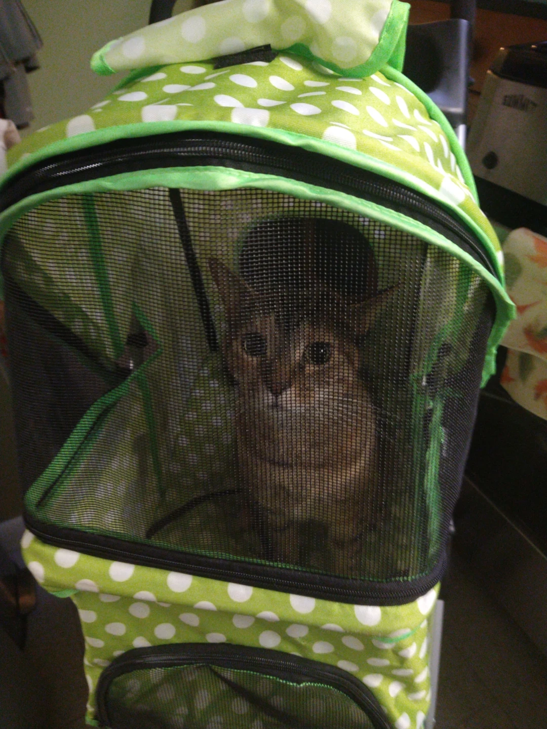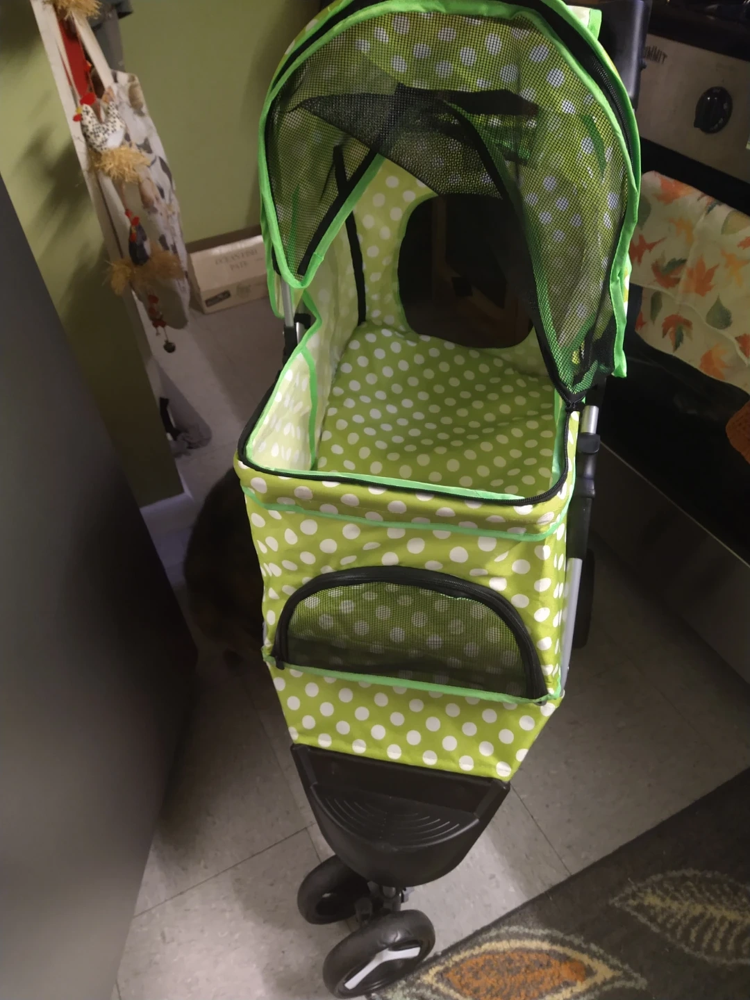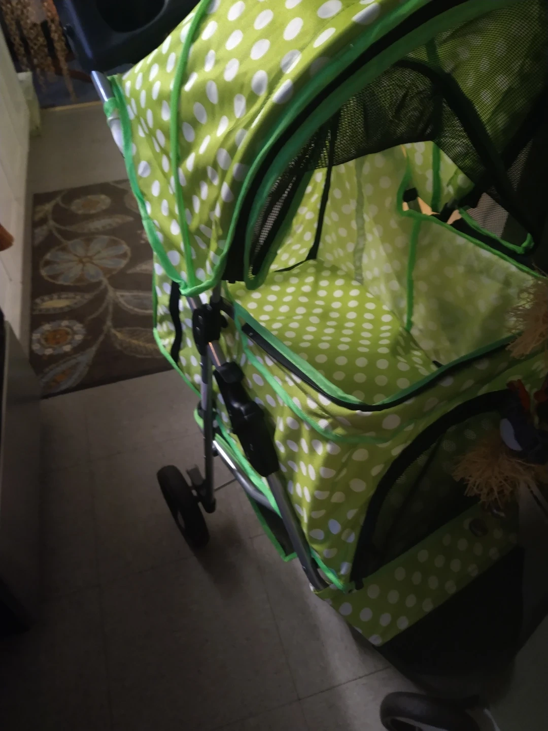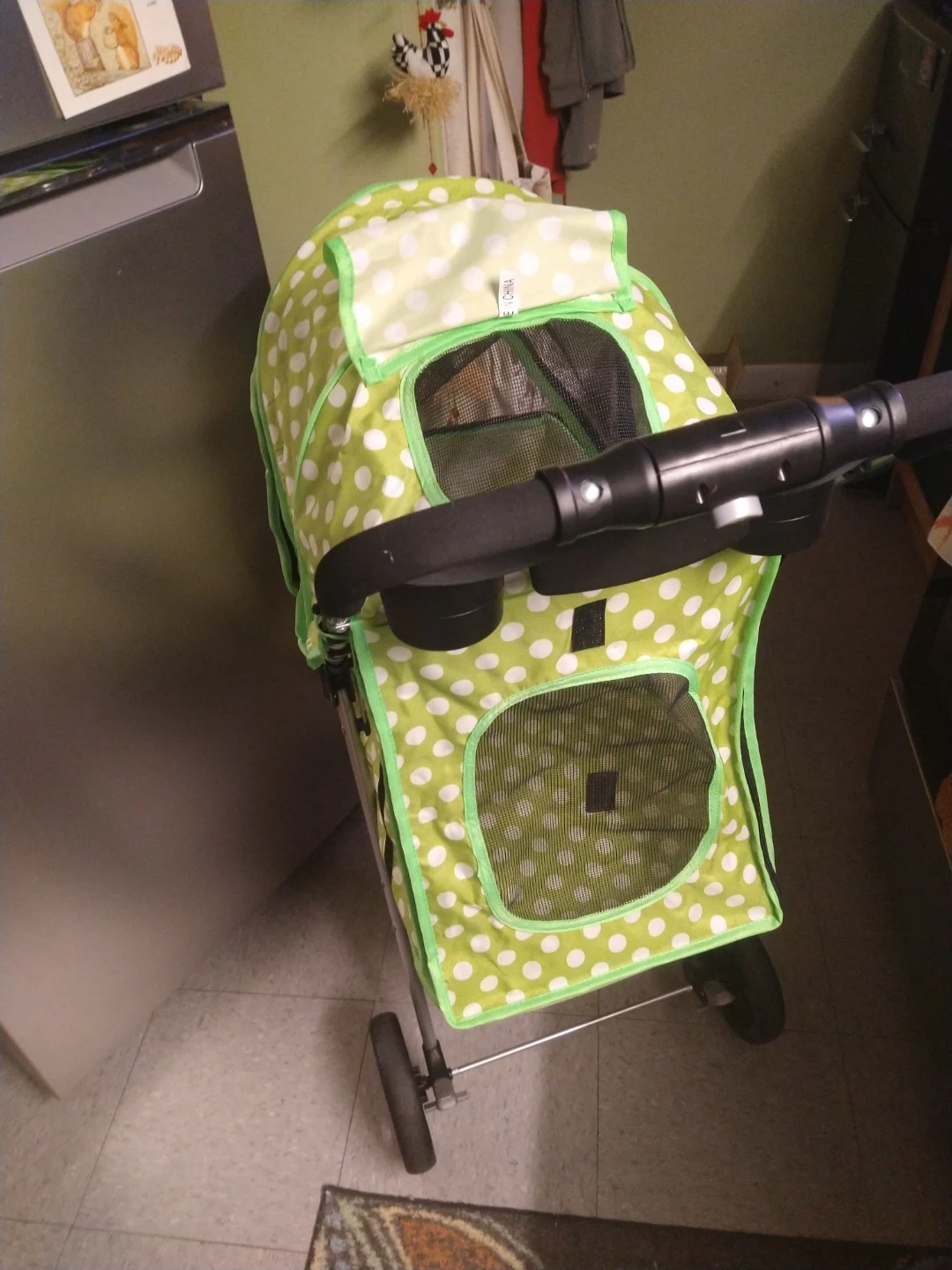 Selling a cute companion animal stroller in a fun green and white polka dot pattern! It's perfect for taking your furry friend for a walk in style and comfort, esp if he or she is older and has trouble walking or is vulnerable to illness. The stroller features a mesh window for ventilation and visibility, and a convenient storage basket underneath for your essentials.