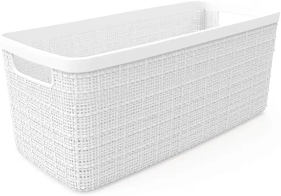 This white storage basket is perfect for organizing your home. It's made of durable plastic with a woven texture and integrated handles for easy carrying. Dimensions are 13.6" L x 6.7" W x 5.7" H. Use it for pantry items, craft supplies, or bathroom essentials!