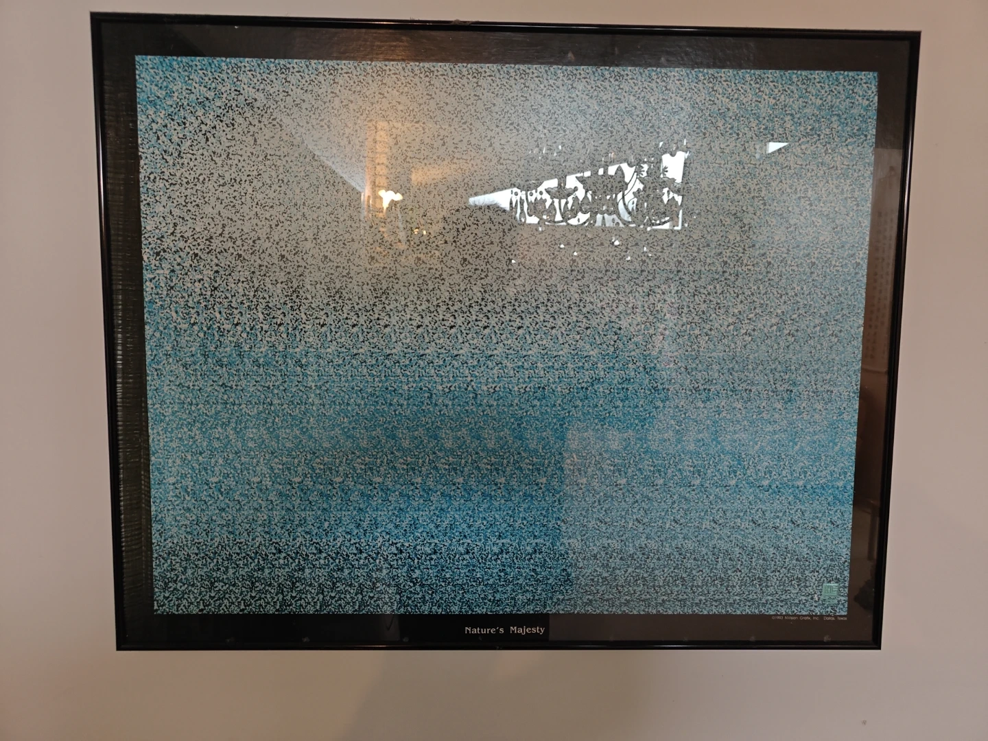 This framed print is titled "Nature's Majesty". It features a speckled abstract design with a gradient from light at the top to blue at the bottom. The frame is black. It's ready to hang on your wall!