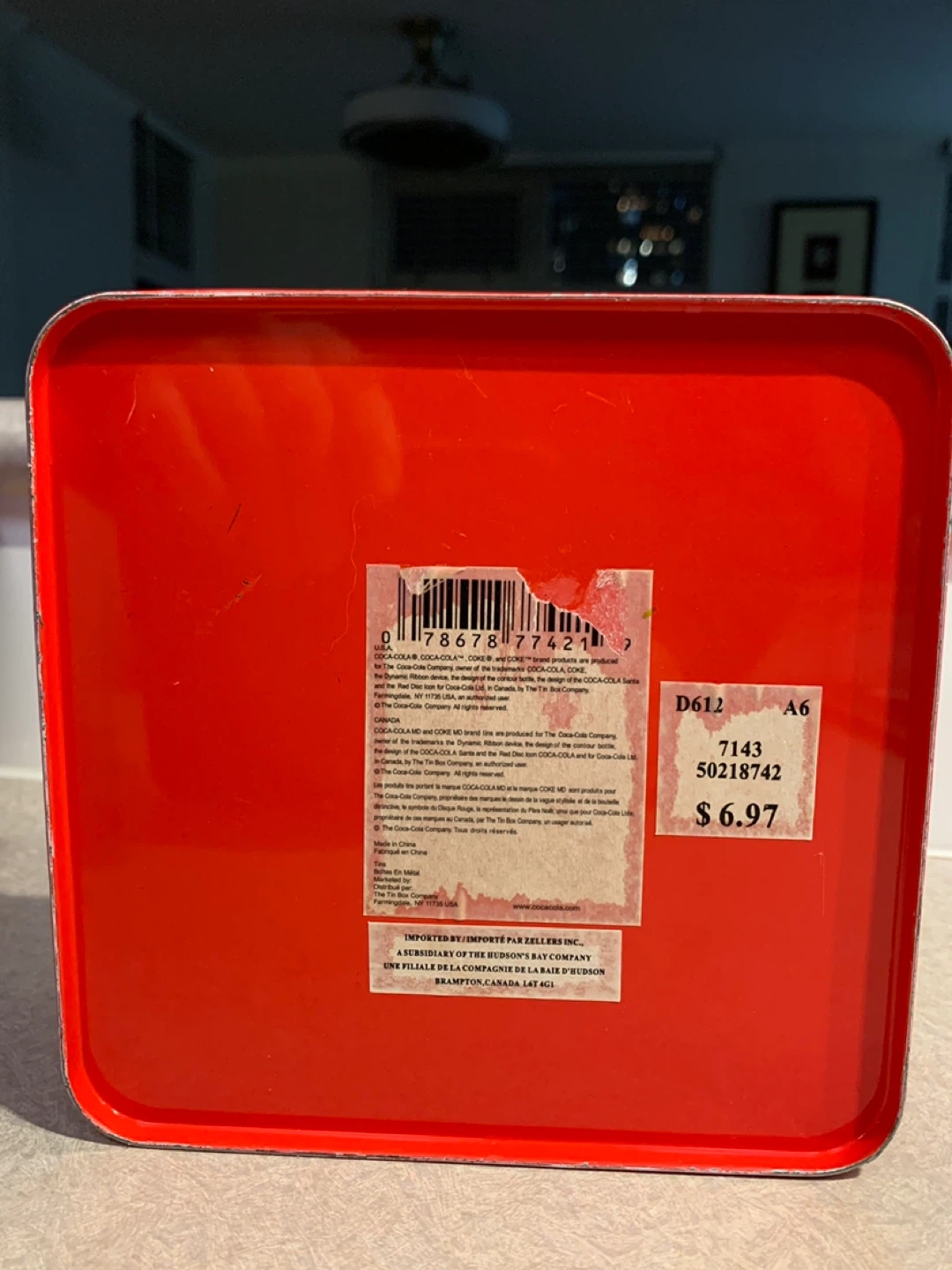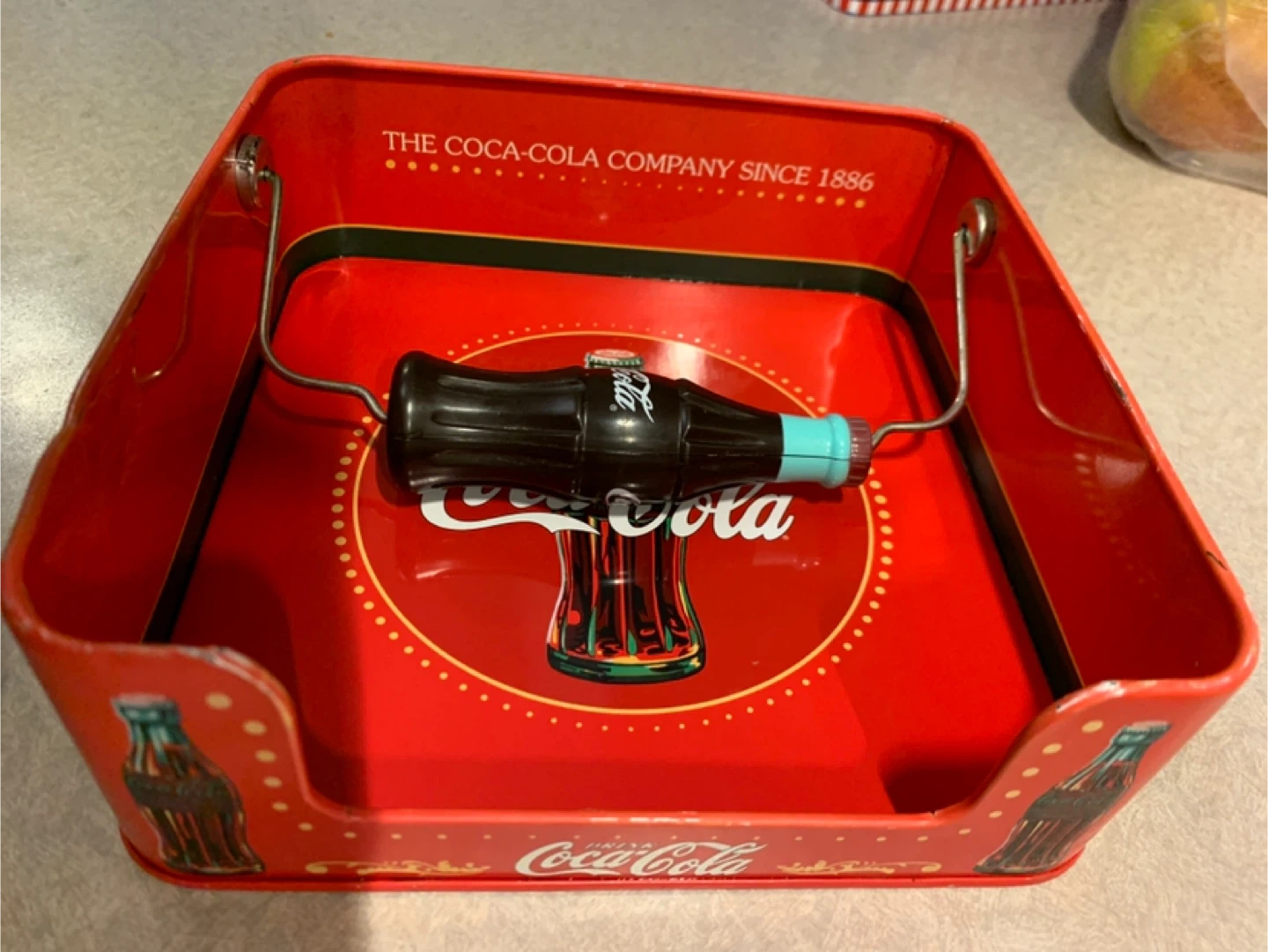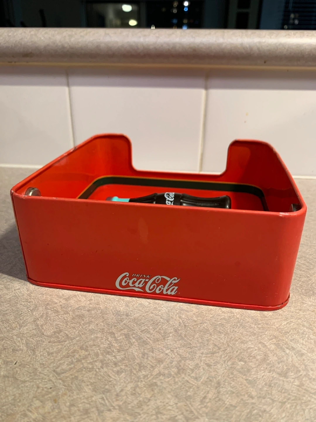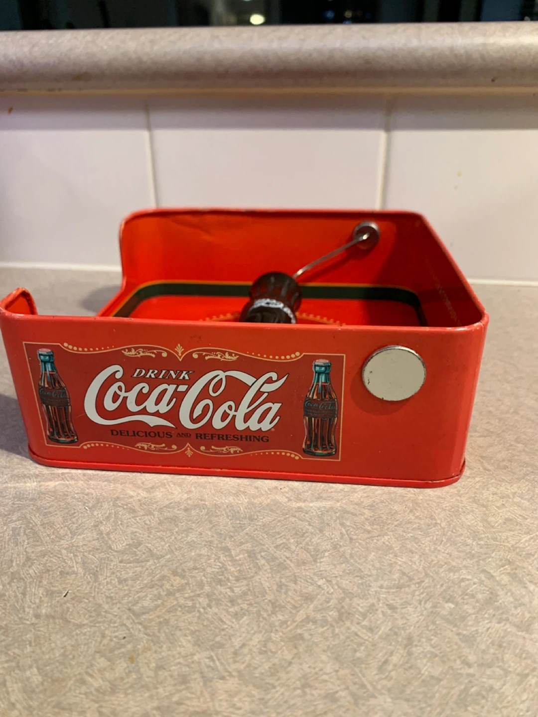 This red metal napkin holder features classic Coca-Cola branding. It has a decorative bottle design holding the napkins in place. It's a neat retro addition for your kitchen or dining table!