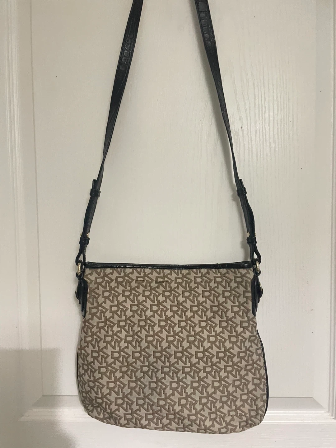 This DKNY crossbody bag features the signature all-over logo print. It has a black textured flap closure with a gold-tone buckle detail. The adjustable strap is black.