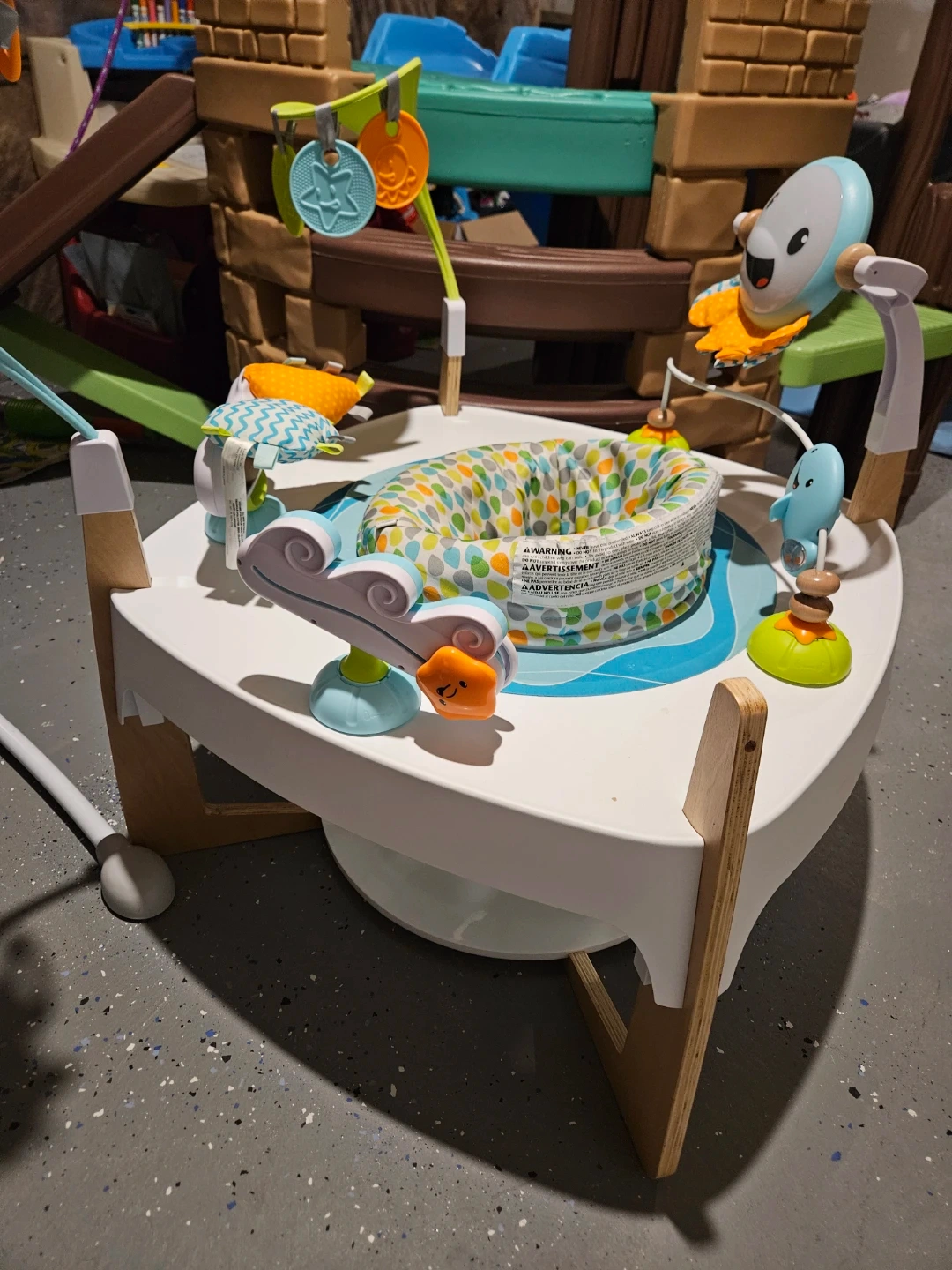 This Fisher-Price jumper features a 360-degree seat with soft springs for gentle bouncing. It includes multiple toys like spinners and teethers for sensory exploration. This activity jumper is suitable for babies from birth up to 25 lbs.
