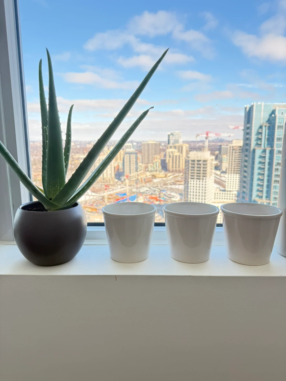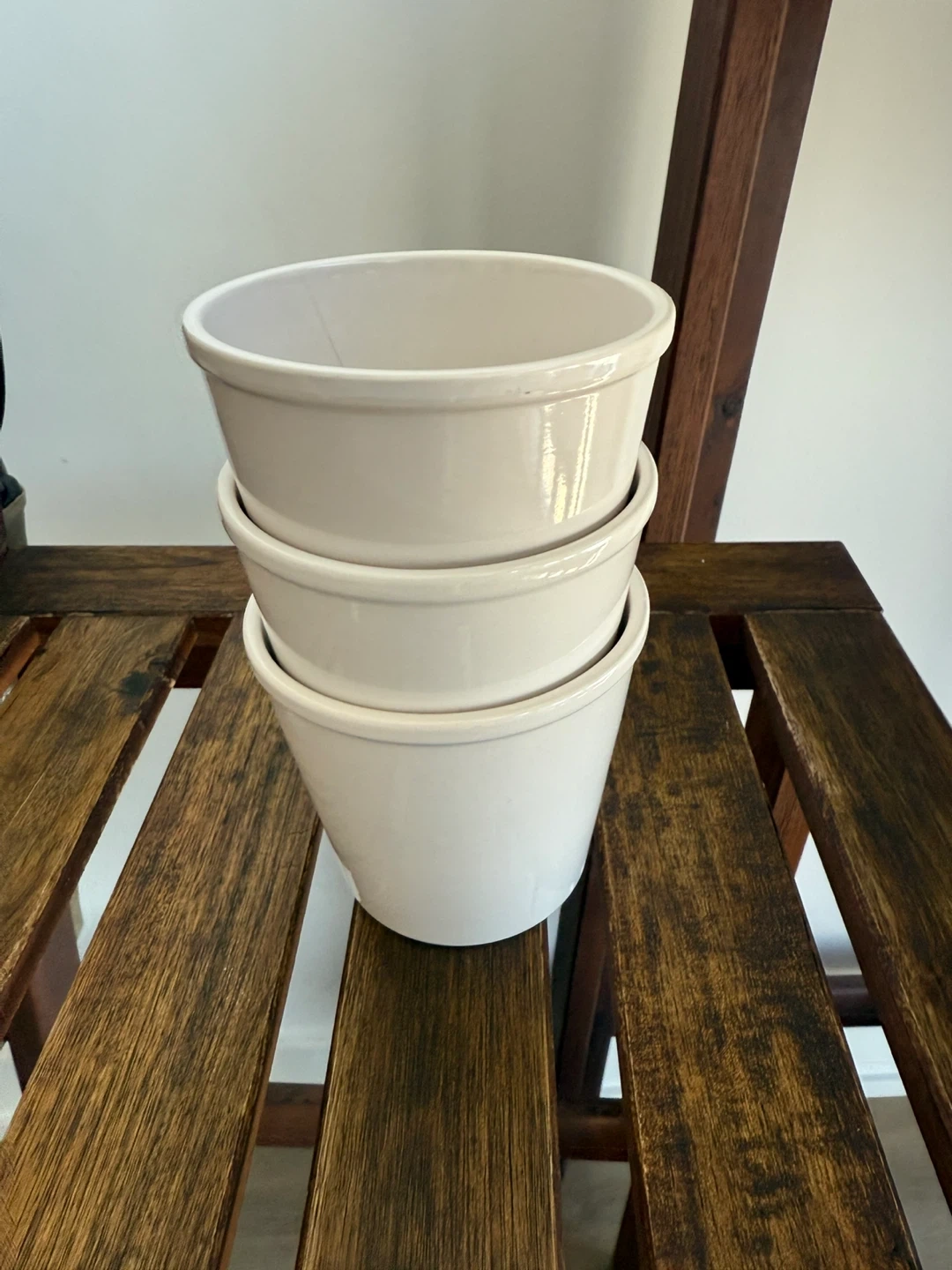 Set of three white ceramic plant pots. These pots are perfect for small to medium-sized plants. I could give the aloe vera with the pot for $5.